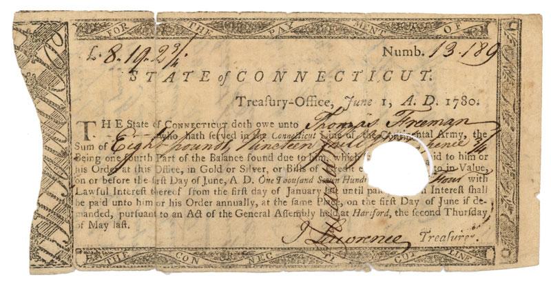 Note Number 13189 for £8.19.2 3/4 issued to Thomas Freeman. The note is signed on verso by Freeman, “Thomas Freeman.” Freeman, a resident of Saybrook, served in 1775 and again from 1777 to 1782. Circular punch cancellation. Fold split contemporaneously repaired with stitching.