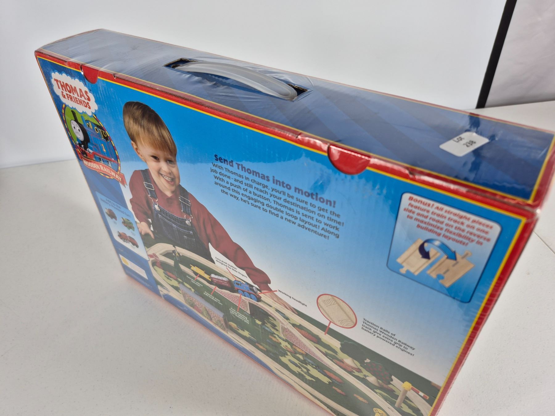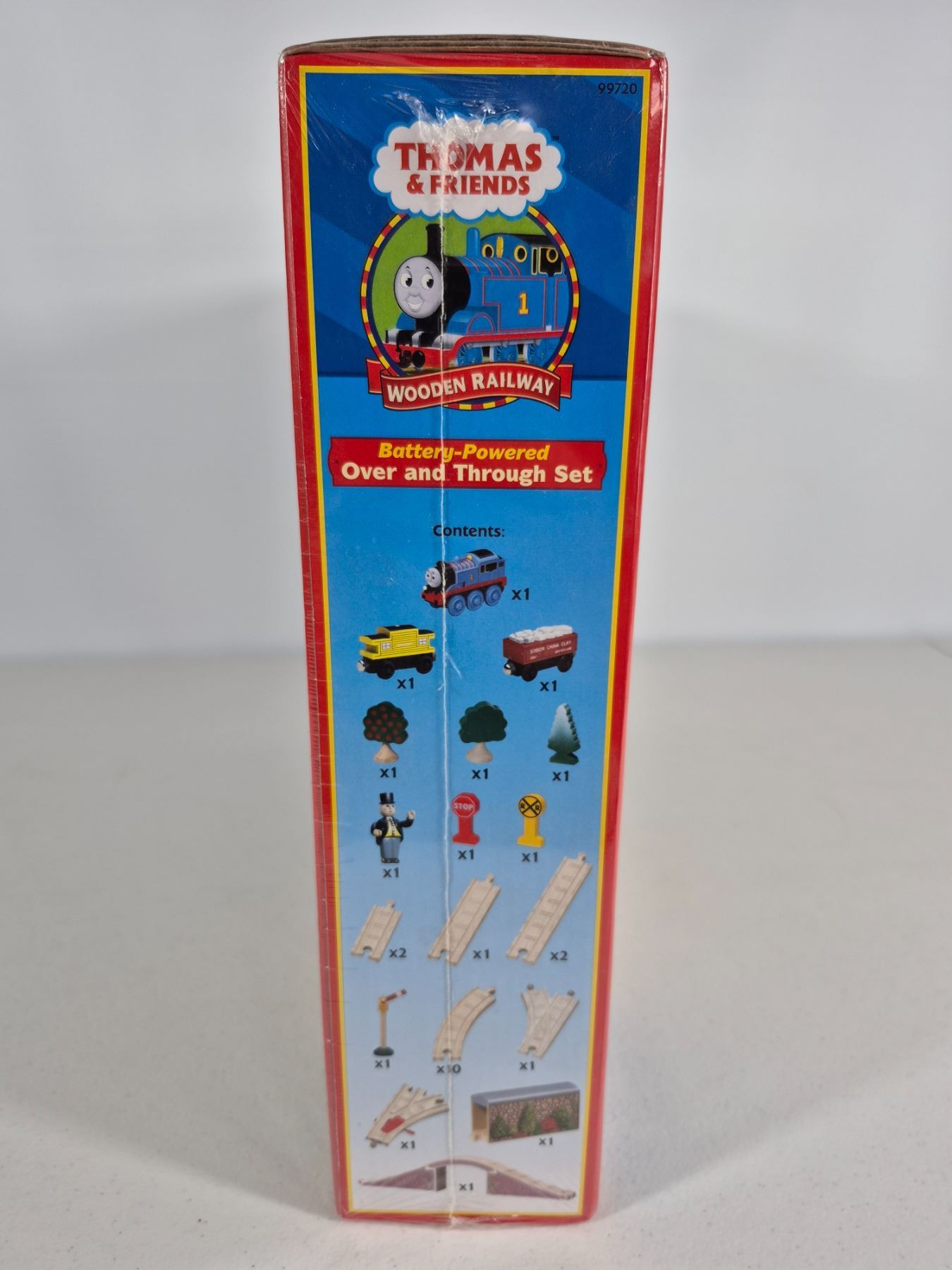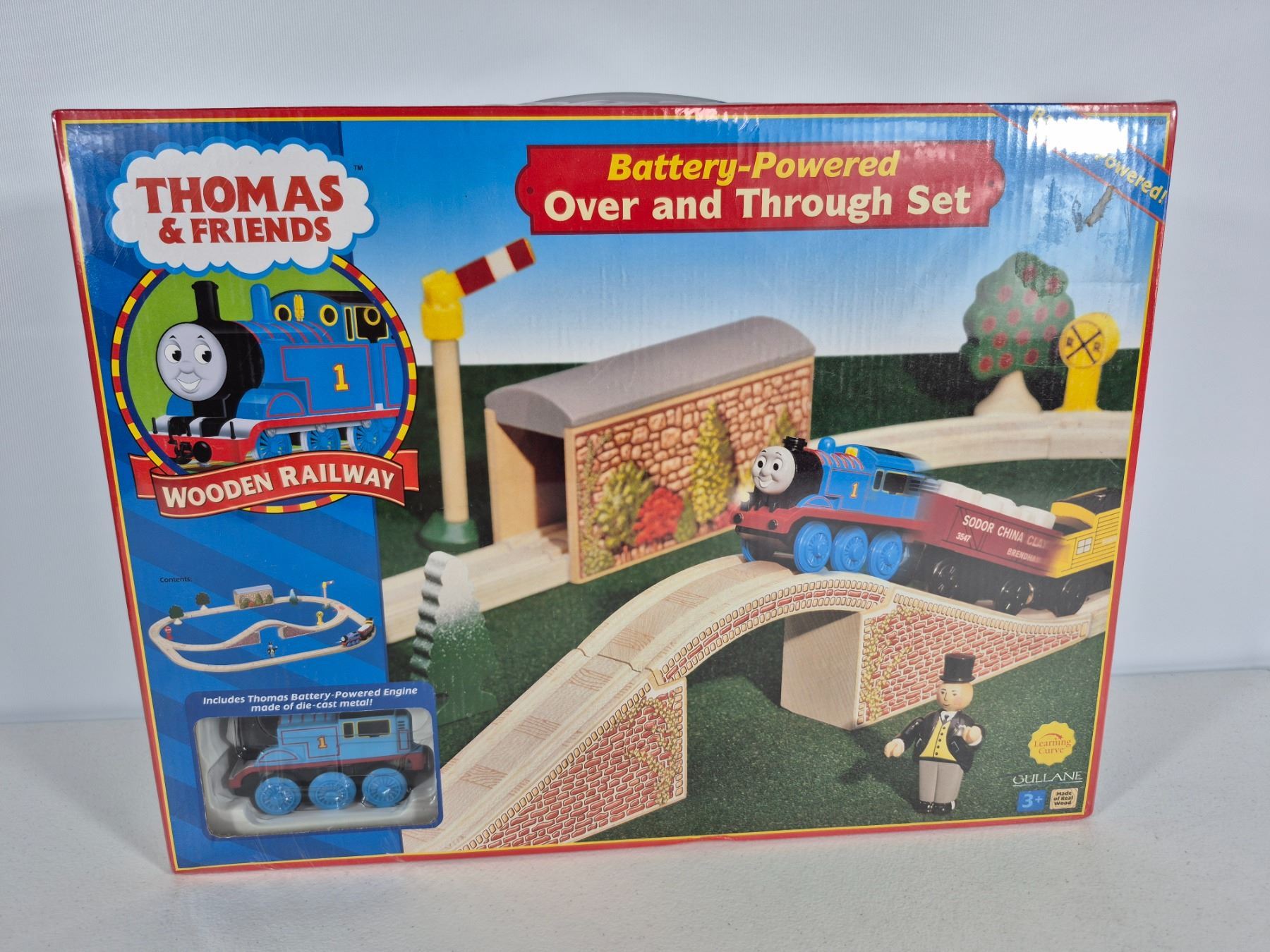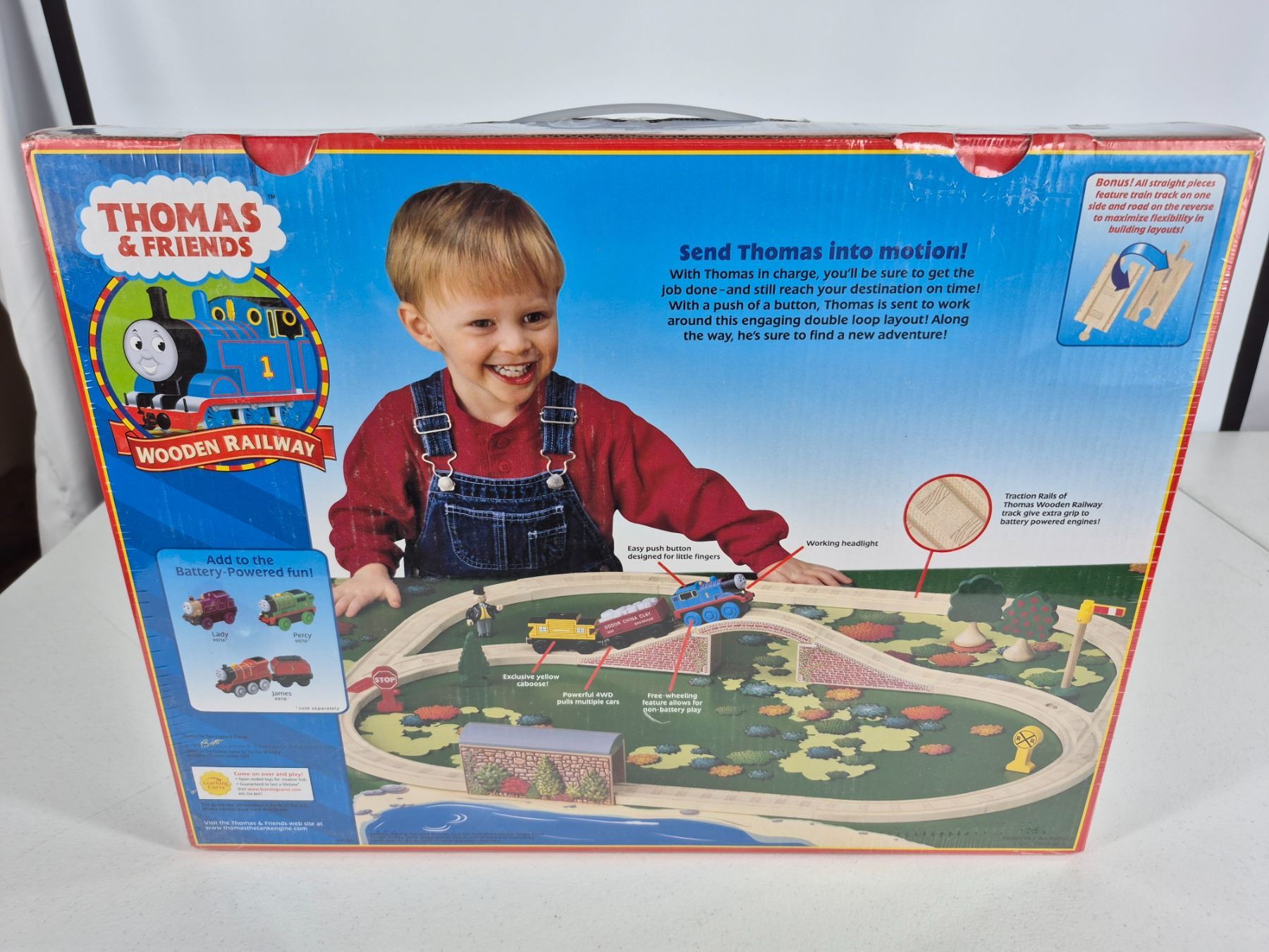 Thomas & Friends Wooden Railway playset by Learning Curve. Includes die-cast battery-powered Thomas engine, wooden track pieces, bridge, and accessories. Boxed and complete.