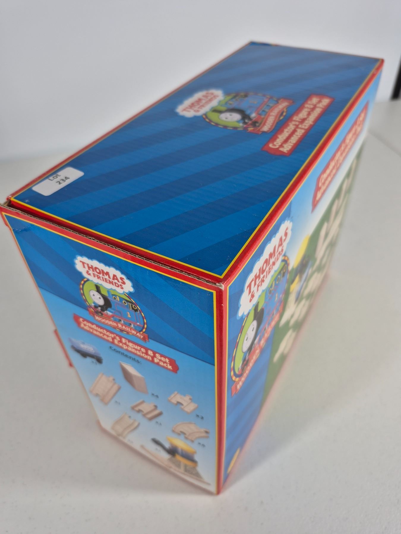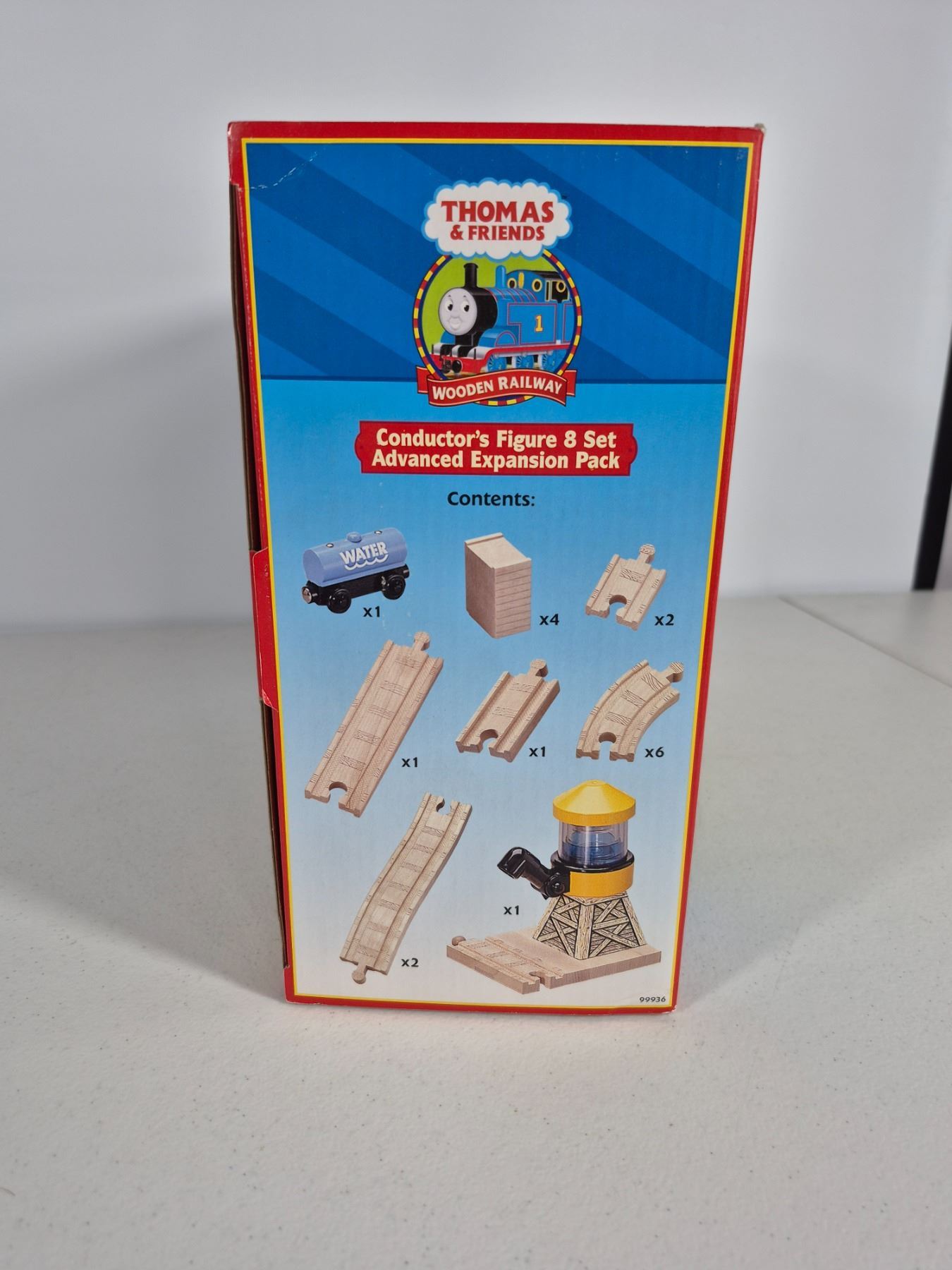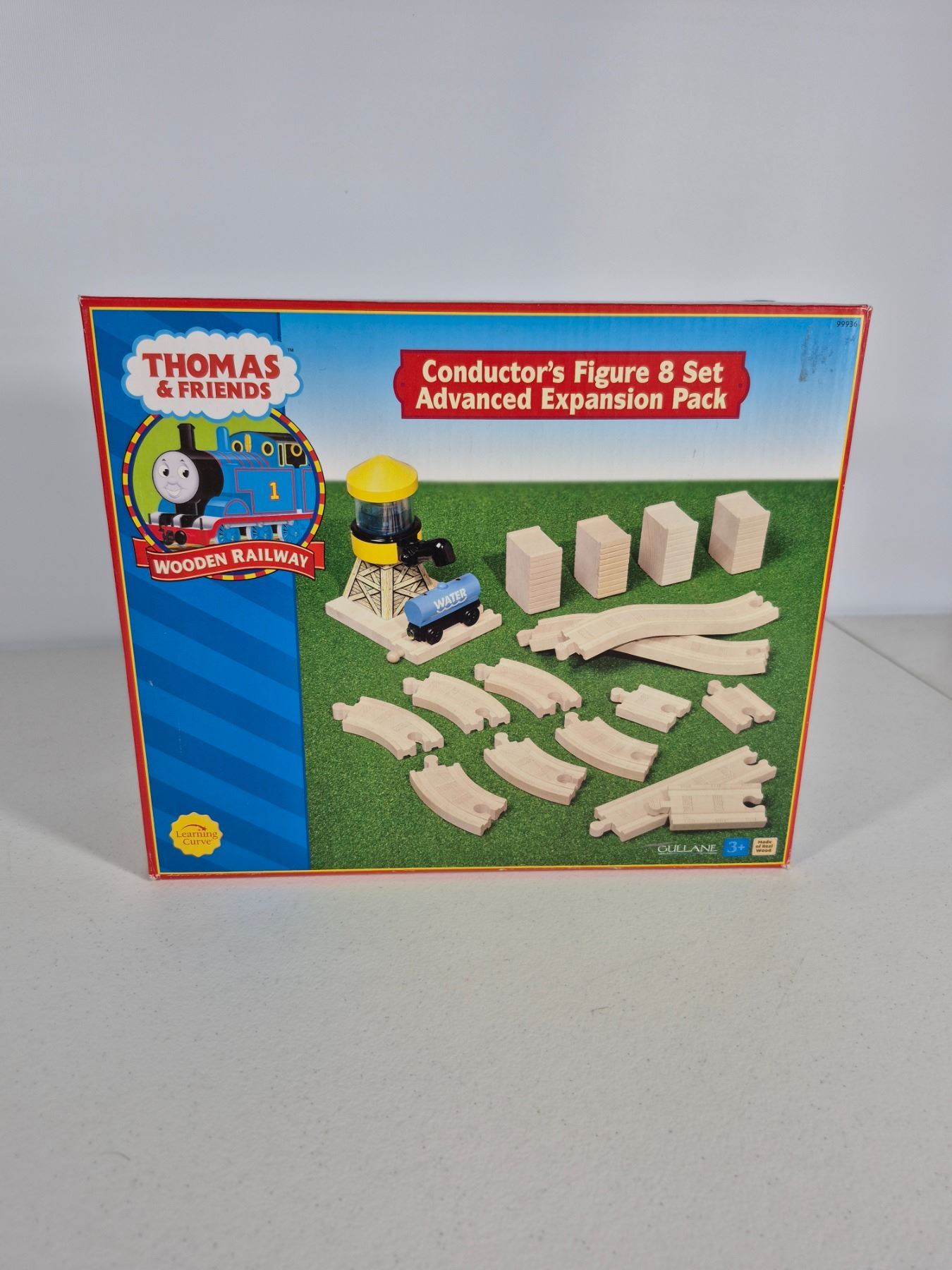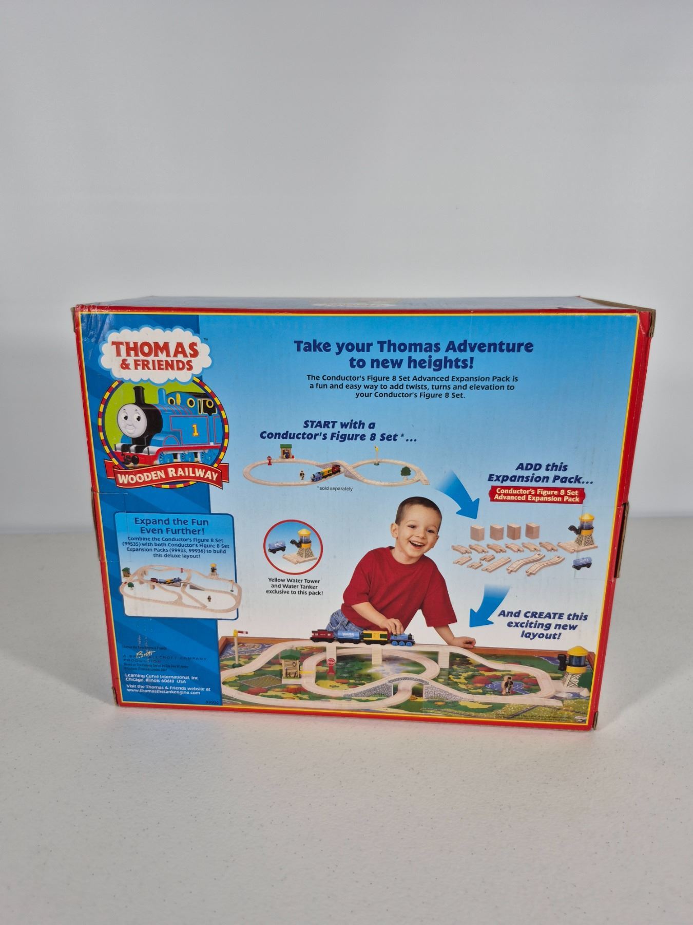 Thomas & Friends Wooden Railway expansion pack by Learning Curve. Includes curved track pieces, risers, and water tower. For ages 3+, boxed and complete.