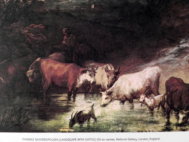 Artist: Thomas GainsboroughTitle: Landscape with CattleOriginal in National Gallery- London, EnglandMedium: Lithograph print on paperImage size: 15 3/4" x 11 3/4"Sheet size: 20 1/4" x 15 1/2"Condition: ExcellentBiography:Thomas Gainsborough (1727-1788) was noted for the speed with which he applied his paint, and he worked more from his observations of nature (and of human nature) than from any application of formal academic rules. The poetic sensibility of his paintings caused Constable to say, "On looking at them, we find tears in our eyes and know not what brings them." He himself said, "I'm sick of portraits, and wish very much to take my viol-da-gam and walk off to some sweet village, where I can paint landskips (sic) and enjoy the fag end of life in quietness and ease." This likeness of landscapes is shown in the way he merged the figures of the portraits with the scenes behind them. His later work was characterised by a light palette and easy, economical strokes