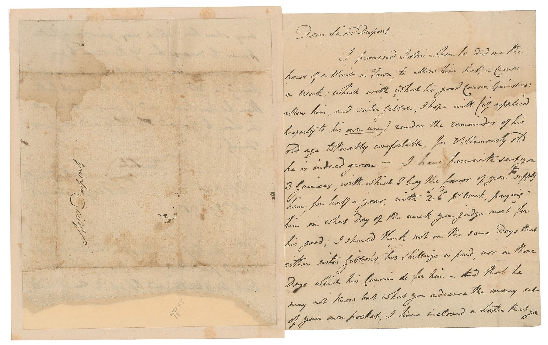 English portrait and landscape painter (1727–1788) considered to be one of the most important portraitists of the 18th century. ALS signed “Tho: Gainsborough,” two pages on two adjoining sheets, 7.25 x 9, September 29, 1783. Letter to "Sister Dupont," his sister Sarah, written from his home at Pall Mall in London. In full: "I promised John when he did me the honor of a Visit in Town, to allow him half a Crown a week; which with what his good Cousin Gainsbro: allow him, and Sister Gibbon, I hope will (if applied properly to his own use) render the remainder of his old age tolerably comfortable; for Villainously old he is indeed grown—I have herewith sent you 3 Guineas, with which I beg the favor of you to supply him for half a year, with 2.6 pr week, paying him on what Day of the week you judge most for his good; I should think not on the same Days that either Sister Gibbon's two shillings is paid, nor on those Days which his Cousin do for him. And that he may not know but what you advance the money out of your own pocket, I have inclosed a Letter that you may show him; which may give you a better power to manage him, if troublesome to you.