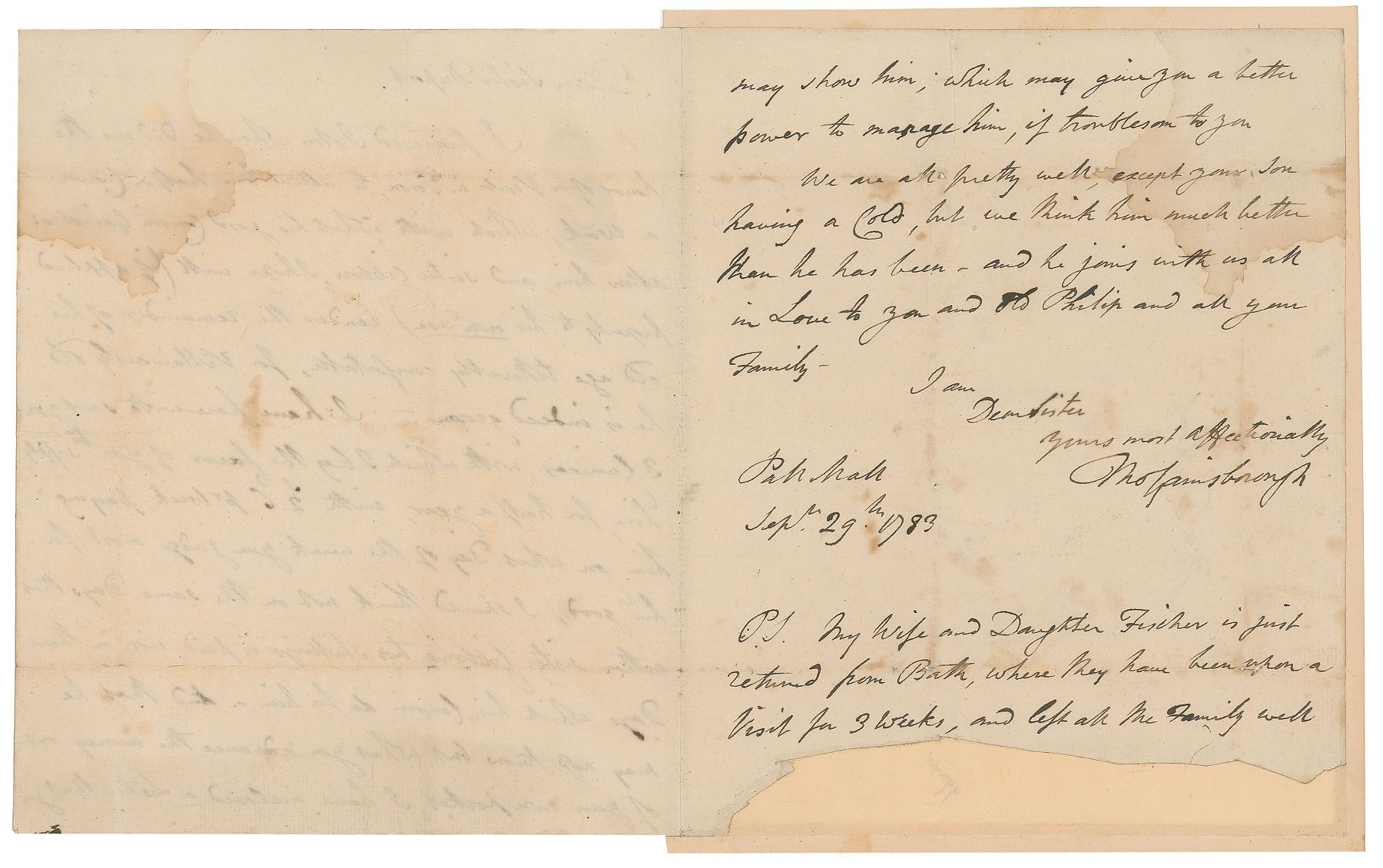 English portrait and landscape painter (1727–1788) considered to be one of the most important portraitists of the 18th century. ALS signed “Tho: Gainsborough,” two pages on two adjoining sheets, 7.25 x 9, September 29, 1783. Letter to "Sister Dupont," his sister Sarah, written from his home at Pall Mall in London. In full: "I promised John when he did me the honor of a Visit in Town, to allow him half a Crown a week; which with what his good Cousin Gainsbro: allow him, and Sister Gibbon, I hope will (if applied properly to his own use) render the remainder of his old age tolerably comfortable; for Villainously old he is indeed grown—I have herewith sent you 3 Guineas, with which I beg the favor of you to supply him for half a year, with 2.6 pr week, paying him on what Day of the week you judge most for his good; I should think not on the same Days that either Sister Gibbon's two shillings is paid, nor on those Days which his Cousin do for him. And that he may not know but what you advance the money out of your own pocket, I have inclosed a Letter that you may show him; which may give you a better power to manage him, if troublesome to you.