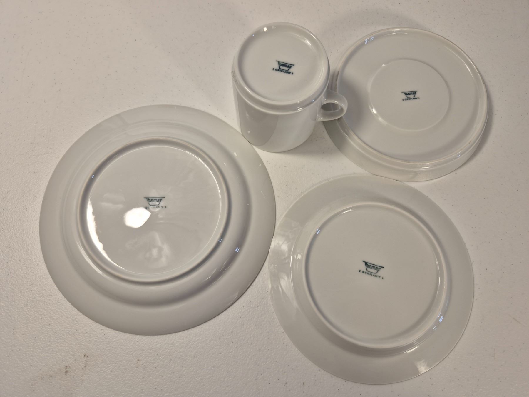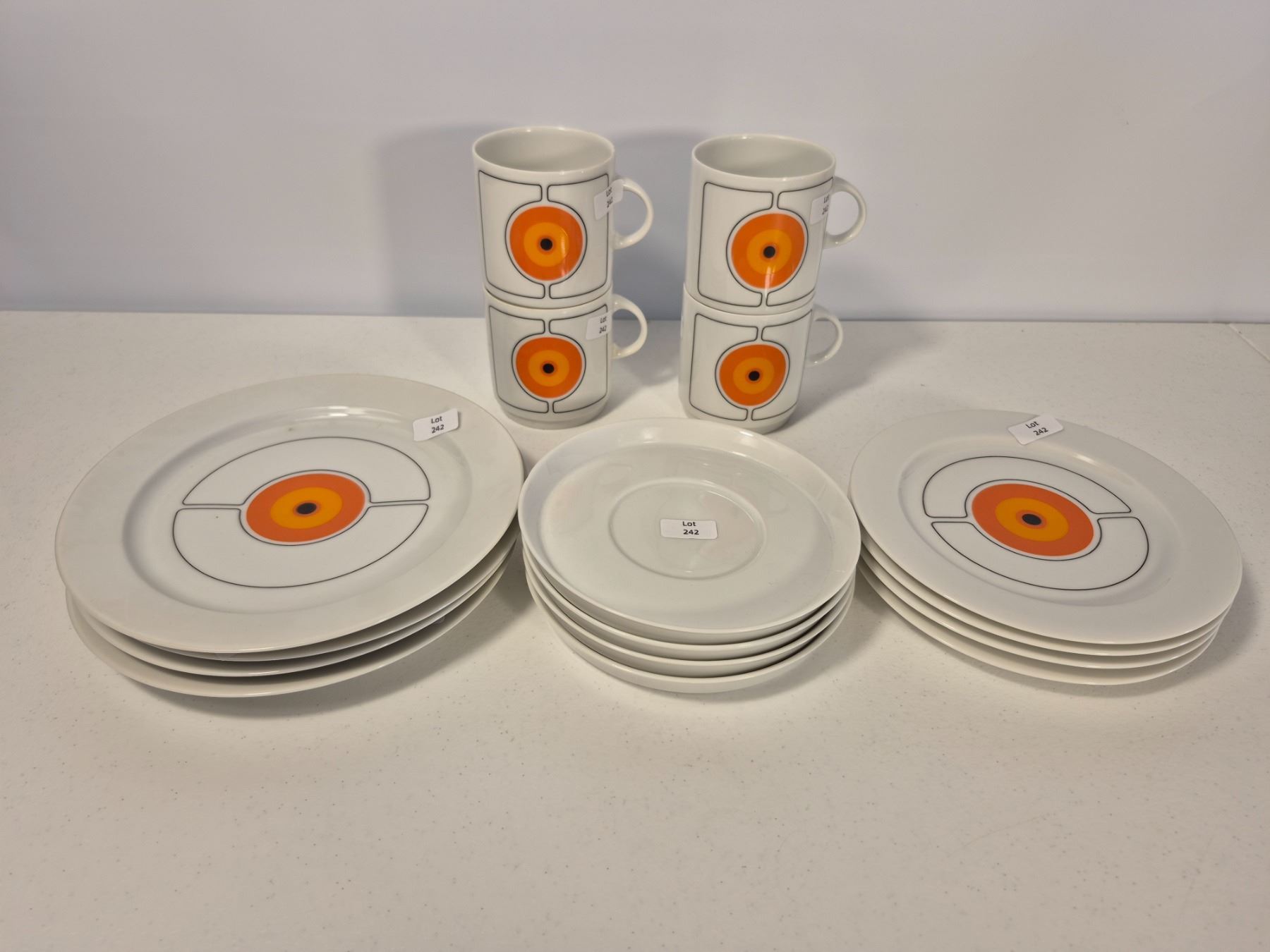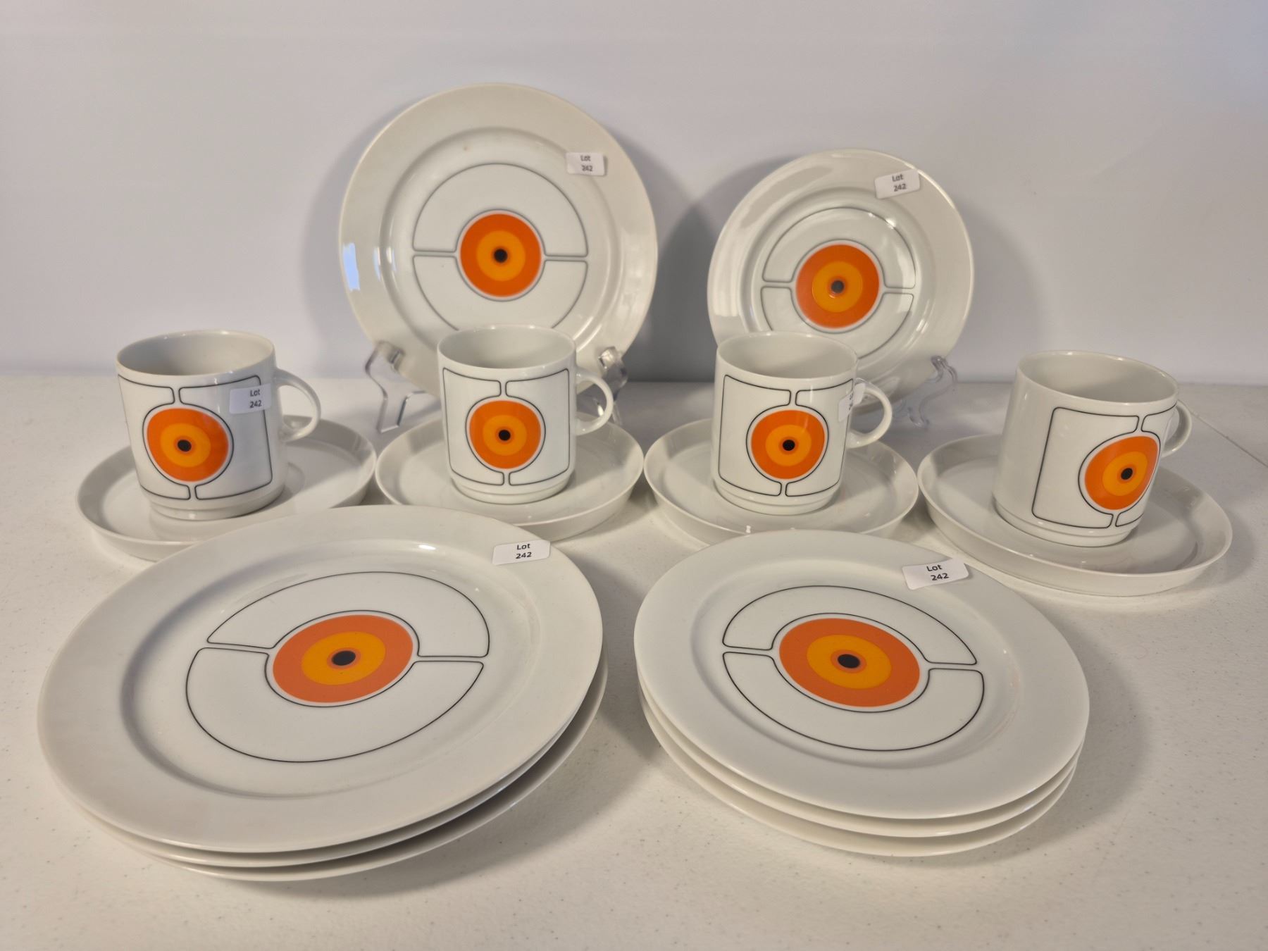 A second lot of vintage Thomas Germany (Rosenthal Group) porcelain in the bold “Eclipse” pattern. Lot includes 16 pieces total: 4 cups, 4 saucers, 4 luncheon plates, and 4 bread & butter plates. Decorated with the iconic concentric circle design in orange, yellow, and black on white. A complete and collectible mid-century modern table set.