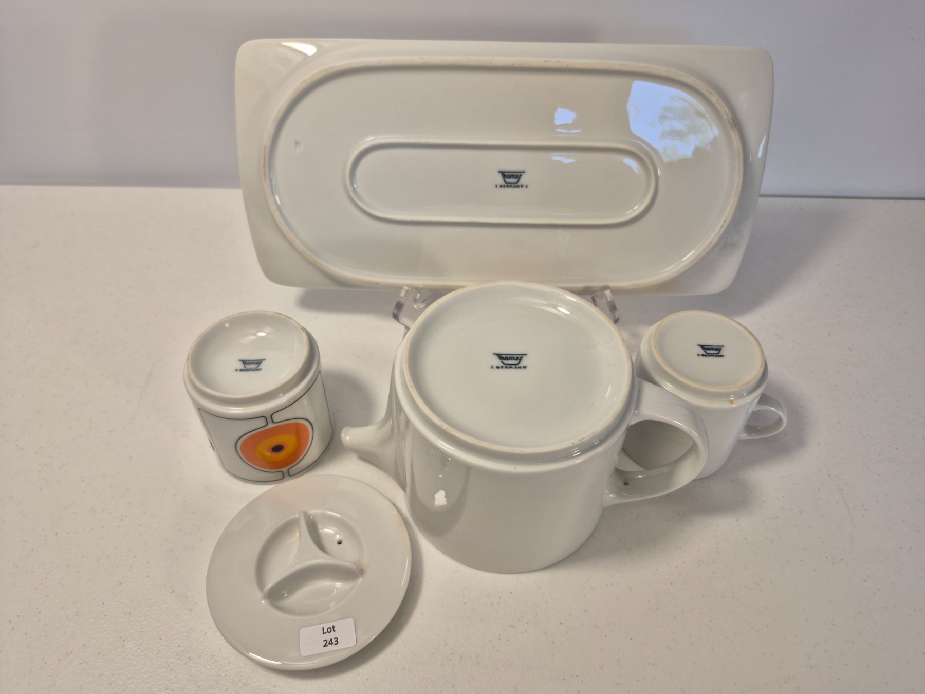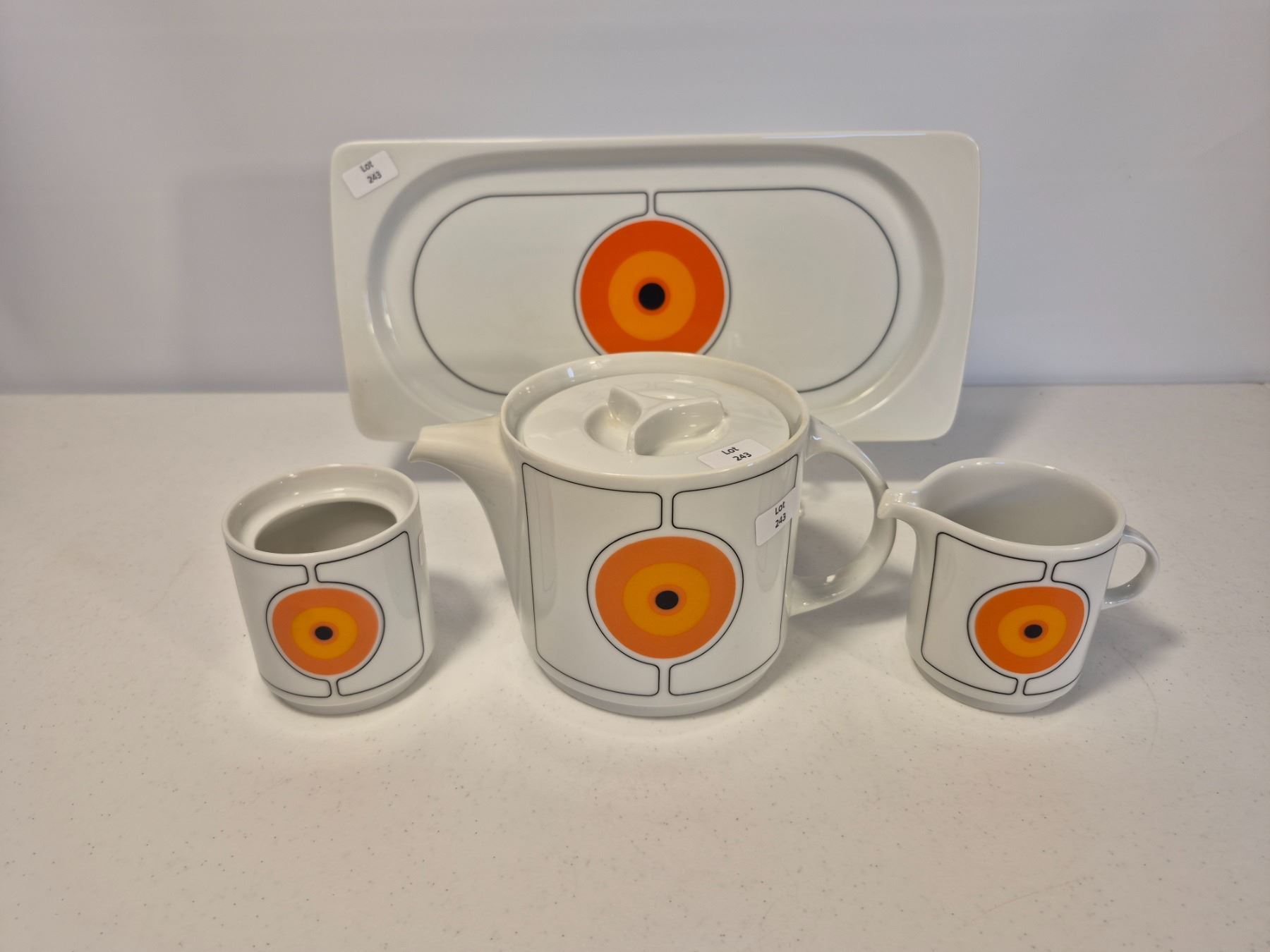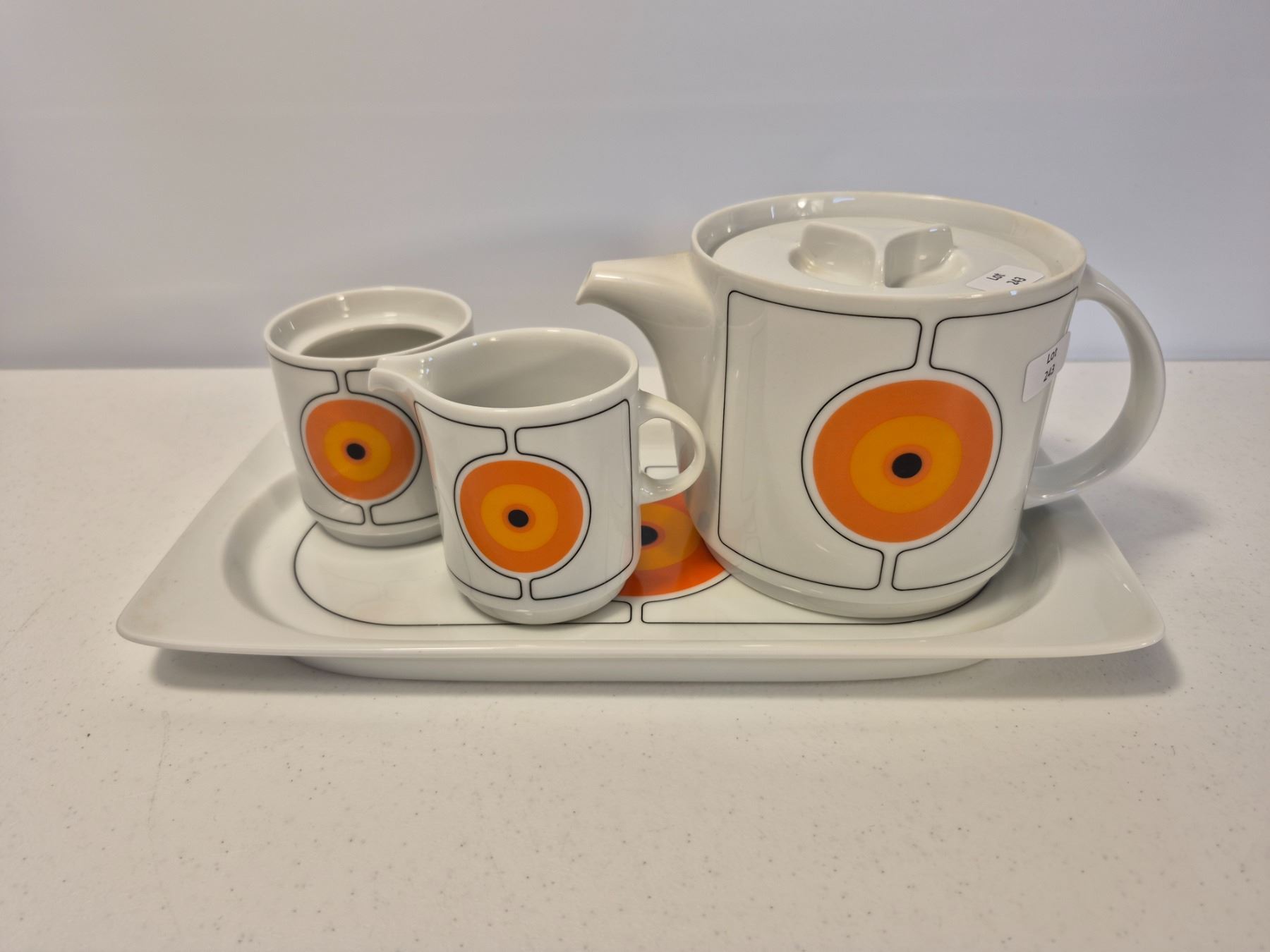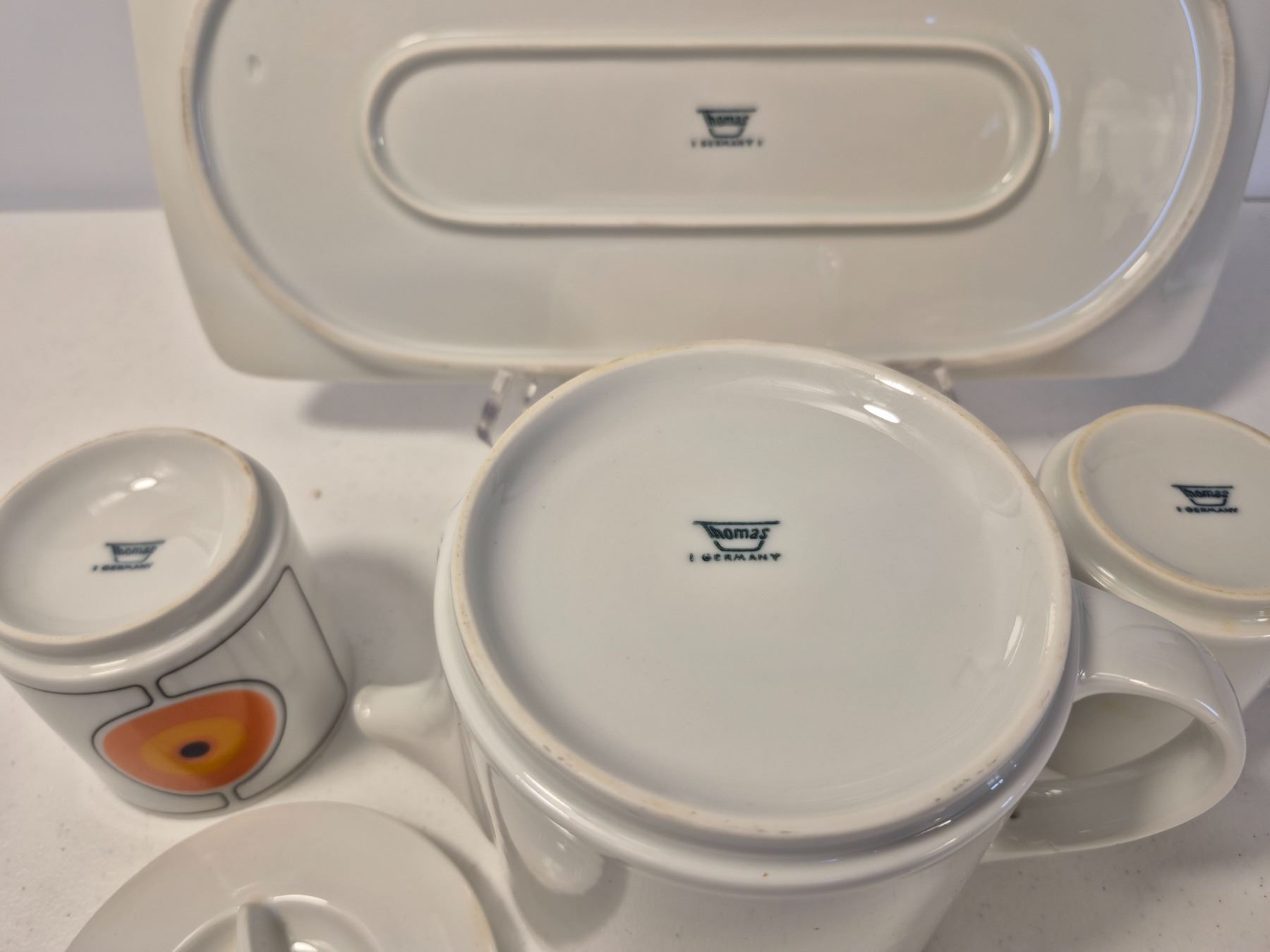 Vintage Thomas Germany (Rosenthal Group) porcelain coffee/tea service in the bold “Eclipse” pattern. Lot includes 5 pieces total: 1 lidded teapot, 1 creamer, 1 covered sugar bowl, and 1 rectangular serving tray. Decorated with the signature concentric orange, yellow, and black circle motif on white. A striking mid-century modern collectible service.