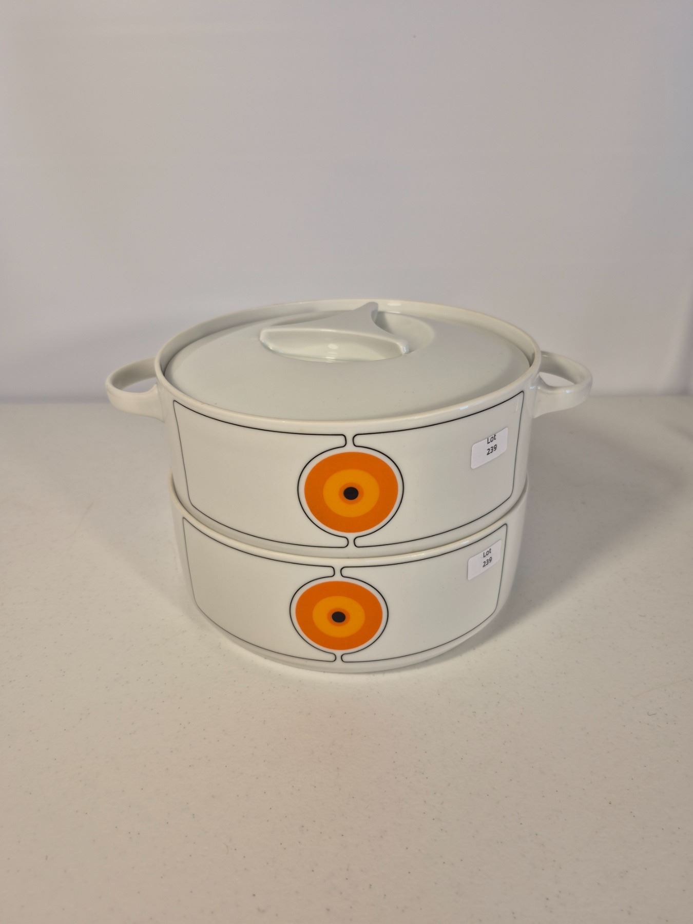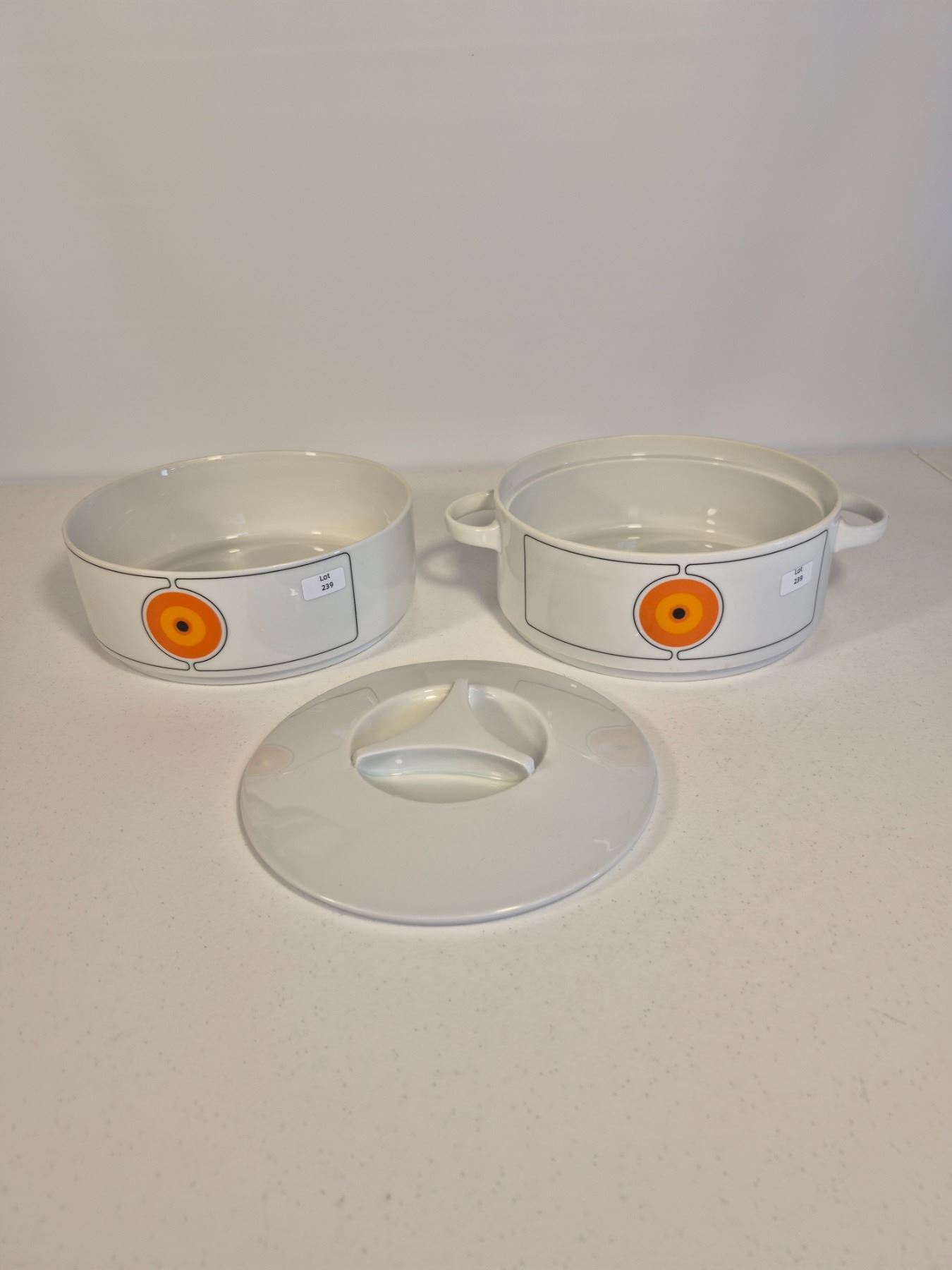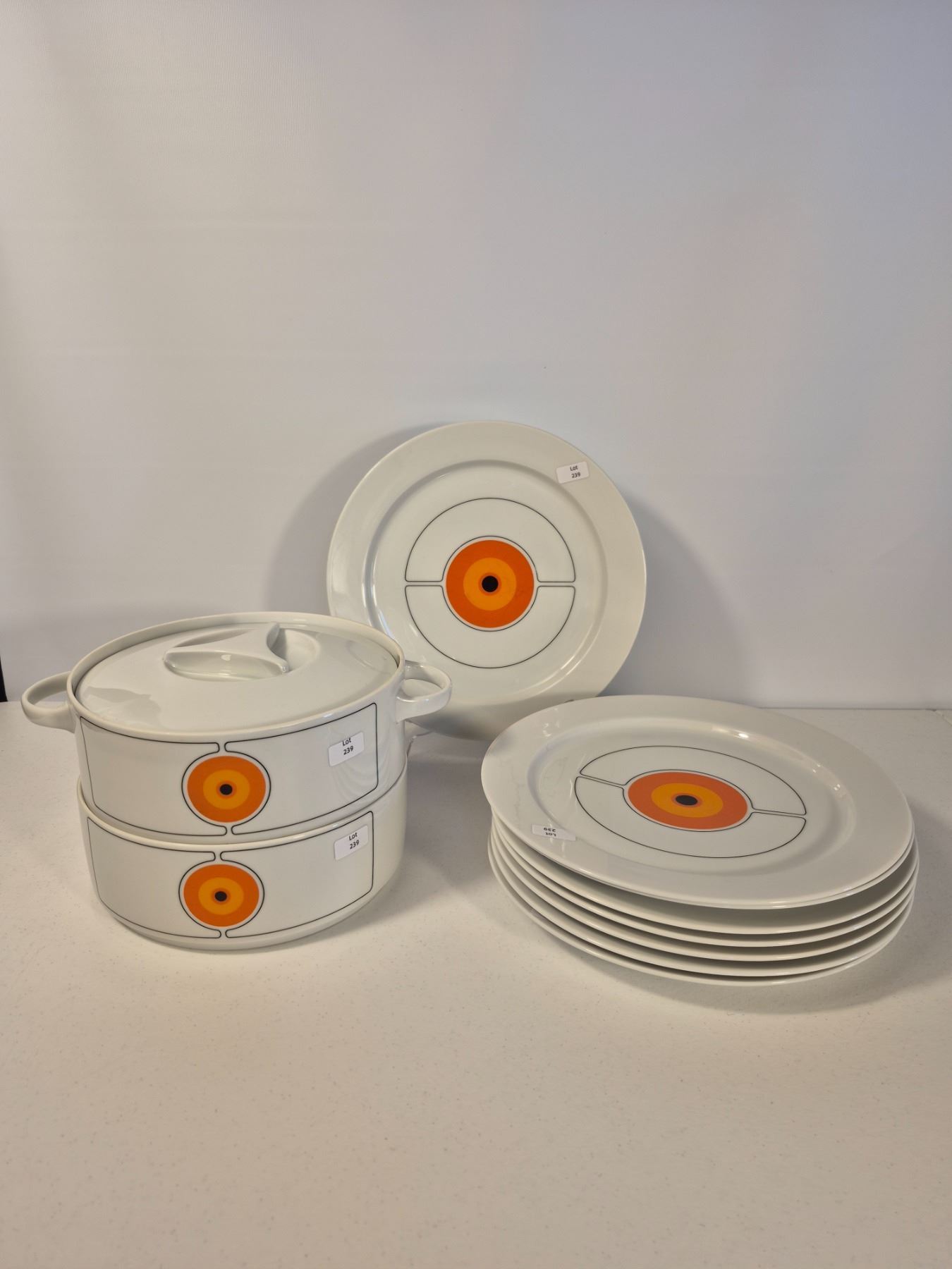 Vintage Thomas Germany (Rosenthal Group) porcelain dinnerware in the sought-after “Eclipse” pattern. Bold concentric circle design in orange, yellow, and black on white. Lot includes 8 pieces total: 6 dinner plates and 2 handled covered serving dishes. Iconic 1970s modernist design, collectible and functional.
