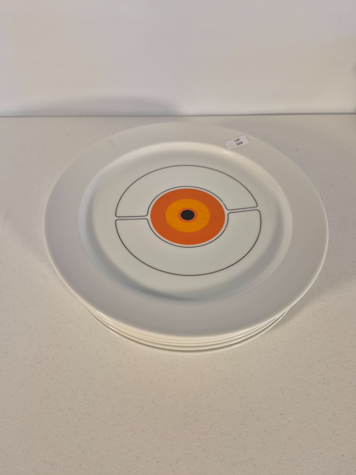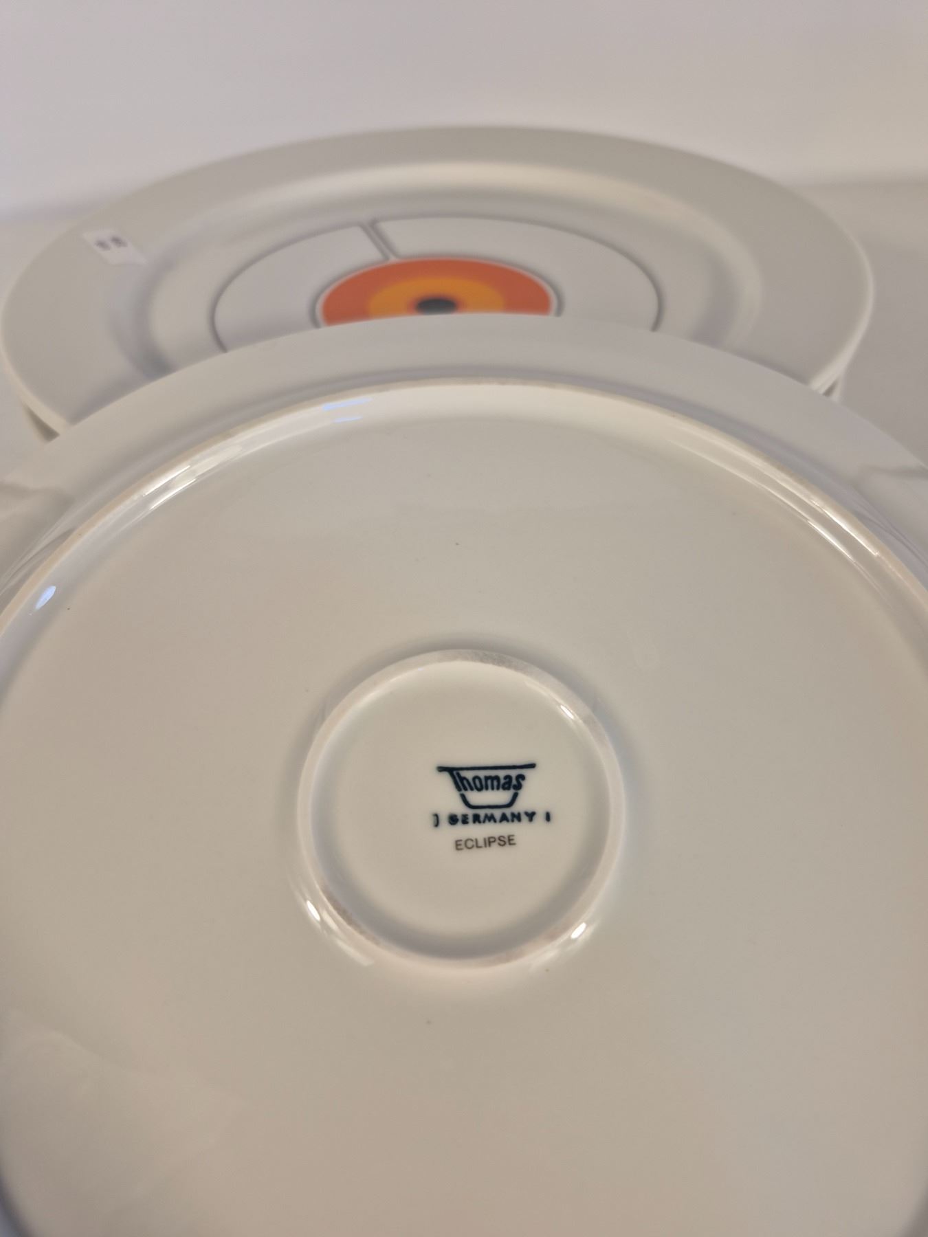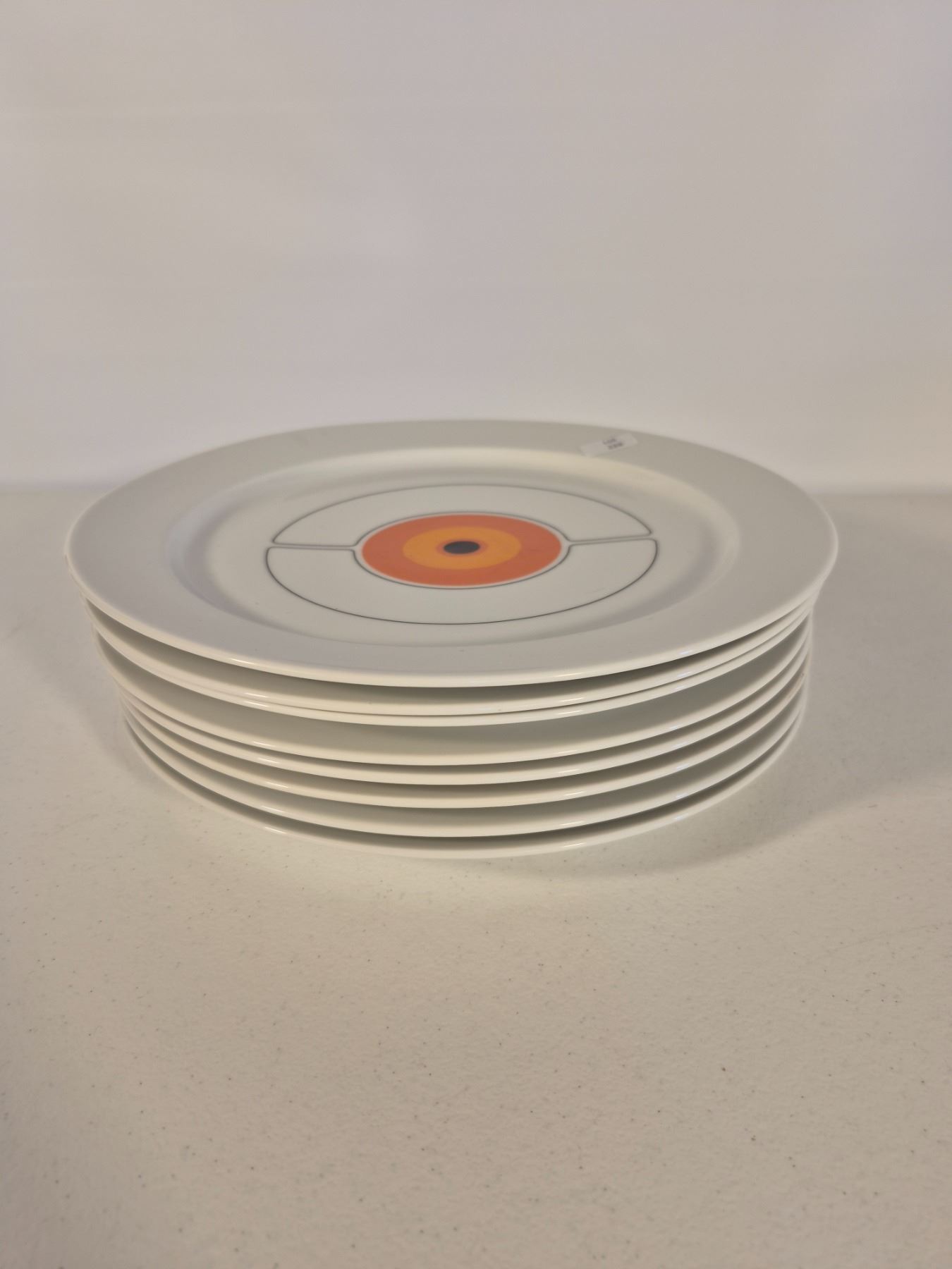 Vintage Thomas Germany (Rosenthal Group) porcelain dinnerware in the sought-after “Eclipse” pattern. Bold concentric circle design in orange, yellow, and black on white. Lot includes 8 pieces total: 6 dinner plates and 2 handled covered serving dishes. Iconic 1970s modernist design, collectible and functional.