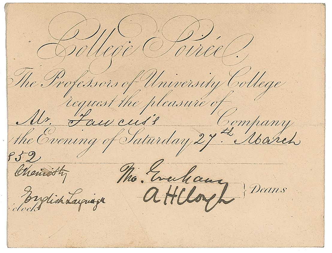 Scottish chemist (1805–1869) who formulated Graham’s Law, discovered and named the process of dialysis and the concept of polybasic acids, introduced the ‘Graham tube,’ and published the Elements of Chemistry. Invitation, signed “Tho. Graham,” one page, 4.25 x 3.5, March 24, 1852. Clipped invitation card to a College Soiree, signed by Graham as Dean. A central horizontal fold and some light toning, otherwise fine condition.