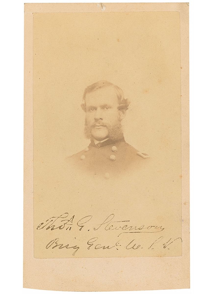 Union general killed in action during the battle of Spotsylvania Courthouse (1836–1864). Original 2.5 x 4 carte-de-visite portrait of Stevenson in uniform by J. W. Black of Boston, signed at the bottom of the image in black ink, “Thos. G. Stevenson, Brig. Gen’l U. S. A.” Light scattered foxing to image, a few dings to edges, some irregular adhesion to signature, and the image a shade light, otherwise fine condition.