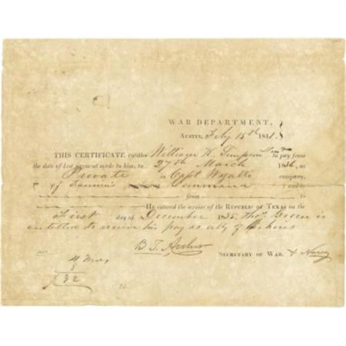 <B>Thomas Green Endorsement on the verso of a Partly-Printed Document Signed "</B></I><B><I>B. T. Archer</B></I></B></I><B>" as "</B></I><B><I>Secretary of War. & Navy</B></I></B></I><B>". </B></I> 1 page, 8.25" x 6.5", Austin, February 5, 1841 being a certificate entitling William K. Simpson (deceased) "...<I>to pay from the date of last payment to him, to 27th March 1836, as Private in Capt Wyatt's company of Tanner's Command...He entered the service of the REPUBLIC OF TEXAS on the Fist day of December 1835.</B></I>.." Green signs on the reverse as Simpson's designated receiver on behalf of the heirs to Simpson's estate. <BR><BR>Thomas Green (1814-64) military leader, was born in Virginia and moved to Tennessee in 1817. He left Tennessee to join the volunteers at the start of the Texas Revolution. Joining Isaac N. Moreland's company in early 1836, which operated the Twin Sisters cannons in the battle of San Jacinto on April 21, 1836. A few days after the battle Green was commissioned a lieutenant; in early May he was made a major and aide-de-camp to Thomas J. Rusk. He resigned on May 30 to continue his law studies in Tennessee. When he returned to settle in Texas in 1837, he was granted land in reward for his army service and became a county surveyor at La Grange, Fayette County. He was elected engrossing clerk for the House of Representatives of the Republic of Texas, a post he held until 1839, when he represented Fayette County in the House of the Fourth Congress. After a term he chose not to run again and resumed the office of engrossing clerk. During the Sixth and Eighth congresses he served as secretary of the Senate. From 1841 to 1861 he was clerk of the state Supreme Court. When the United States went to war with Mexico, Green recruited and commanded a company of Texas Rangers in La Grange as part of the First Texas Regiment of Mounted Riflemen, led by John C. Hays. The Texans helped Zachary Taylor capture Monterrey, Nuevo Leon, in September 1846. After secession in 1861, Green was elected colonel of the Fifth Texas Volunteer Cavalry, which, as part of a brigade led by Gen. H. H. Sibley, joined the invasion of New Mexico in 1862. There Green led the Confederate victory at the battle of Val Verde in February. After a difficult retreat into Texas he led his men, aboard the river steamer <I>Bayou City</B></I>, to assist in the recapture of Galveston on January 1, 1863. In the spring of 1863 Green commanded the First Cavalry Brigade in fighting along Bayou Teche in Louisiana. On May 20 he became a brigadier general. In June he captured a Union garrison at Brashear City but failed to seize Fort Butler on the Mississippi. At Cox's Plantation he defeated a Union advance in July. In September the First Cavalry captured another Union detachment at Stirling's Plantation. A similar success followed in November at Bayou Burbeaux. In four victories Green's men inflicted about 3,000 casualties and suffered only 600. In April 1864 he led a division in successful attacks against Maj. Gen. Nathaniel P. Banks at the battle of Mansfield and against Maj. Gen. William H. Emory at the battle of Pleasant Hill. A few days later, on April 12, 1864, Green was killed on April 12, 1864 while leading an attack on federal gunboats patrolling the Red River at Blair's Landing.<BR><BR>Branch Tanner Archer (1790-1856). Branch Tanner Archer, legislator and secretary of war of the Republic of Texas. A professionally trained physician from Virginia, Archer arrived in Texas in 1831 and quickly joined a group in Brazoria agitating for independence from Mexico. He represented Brazoria at the Convention of 183v and participated in the battle of Gonzales in October 1835. In November 1835 he traveled to San Felipe as representative of Brazoria and there was elected chairman of the Consultation. He urged the members to disregard previous factional divisions and concentrate on what was the best course for Texas. Although he favored independence, he voted with the majority, who favored a return to the Constitution of 1824. The Consultation then selected Archer to join Stephen F. Austin and William H. Whartong as commissioners to the United States to lobby for financial assistance, collect supplies, and recruit men for the Texas cause. The three arrived in New Orleans in January 1836 and negotiated a series of loans that totaled $250,000. Then they proceeded up the Mississippi River, making numerous speeches before turning east for Washington, D.C. During their trip Texas declared its independence, on March 2, 1836. The three commissioners were unable to persuade Congress to support their cause and returned home. After arriving in Texas Archer worked for the election of Austin as president of the young republic. He also served in the First Congress of Texas and as speaker of the House during its second session. In Congress he and James Collinsworth sponsored a law establishing the Texas Railroad, Navigation, and Banking Company. Subsequently, Archer served as President Mirabeau B. Lamar's secretary of war until 1842. Moderate uneven toning and soiling, partial separation at horizontal fold and repaired on verso with tape, else very good. <I>From the collection of Darrel Brown.</B></I><BR><BR><b>Shipping:</b> Flat Material, Small (<a target="_blank" href="http://www.heritageauctions.com/common/shipping.php">view shipping information</a>)