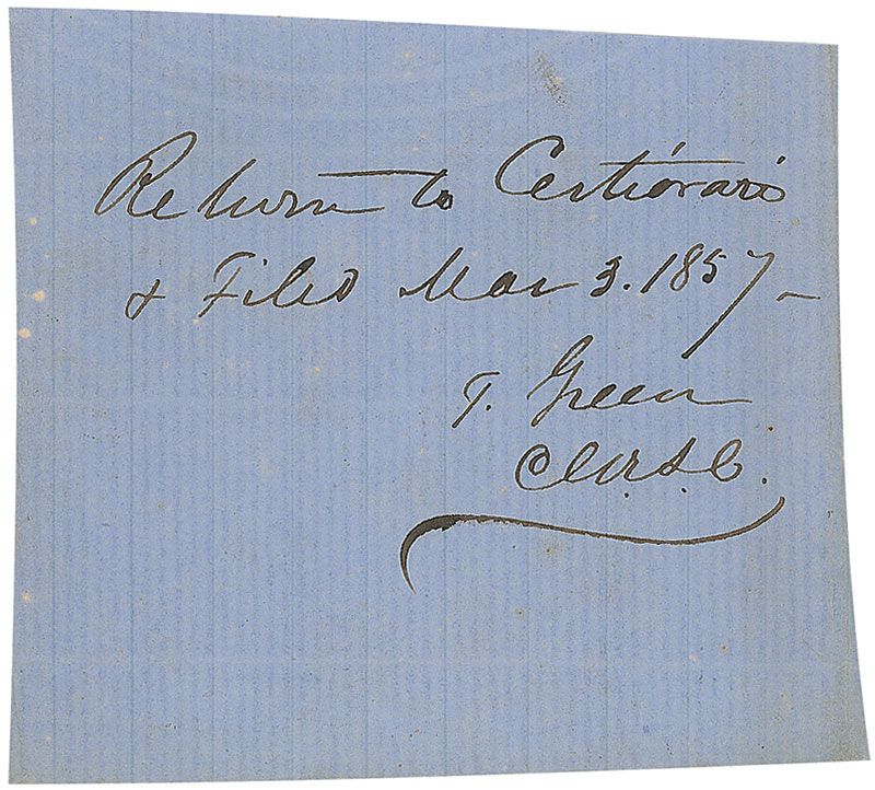 Confederate general (1814–1864) who served in the Texas Cavalry and was mortally wounded in battle. Ink signature, “Return to Certiorari, & Filed Mar. 3, 1857, T. Green, Cl. S. C.,” on a blue 3.25 x 3 lightly-lined slip clipped from a larger document. In fine condition.
