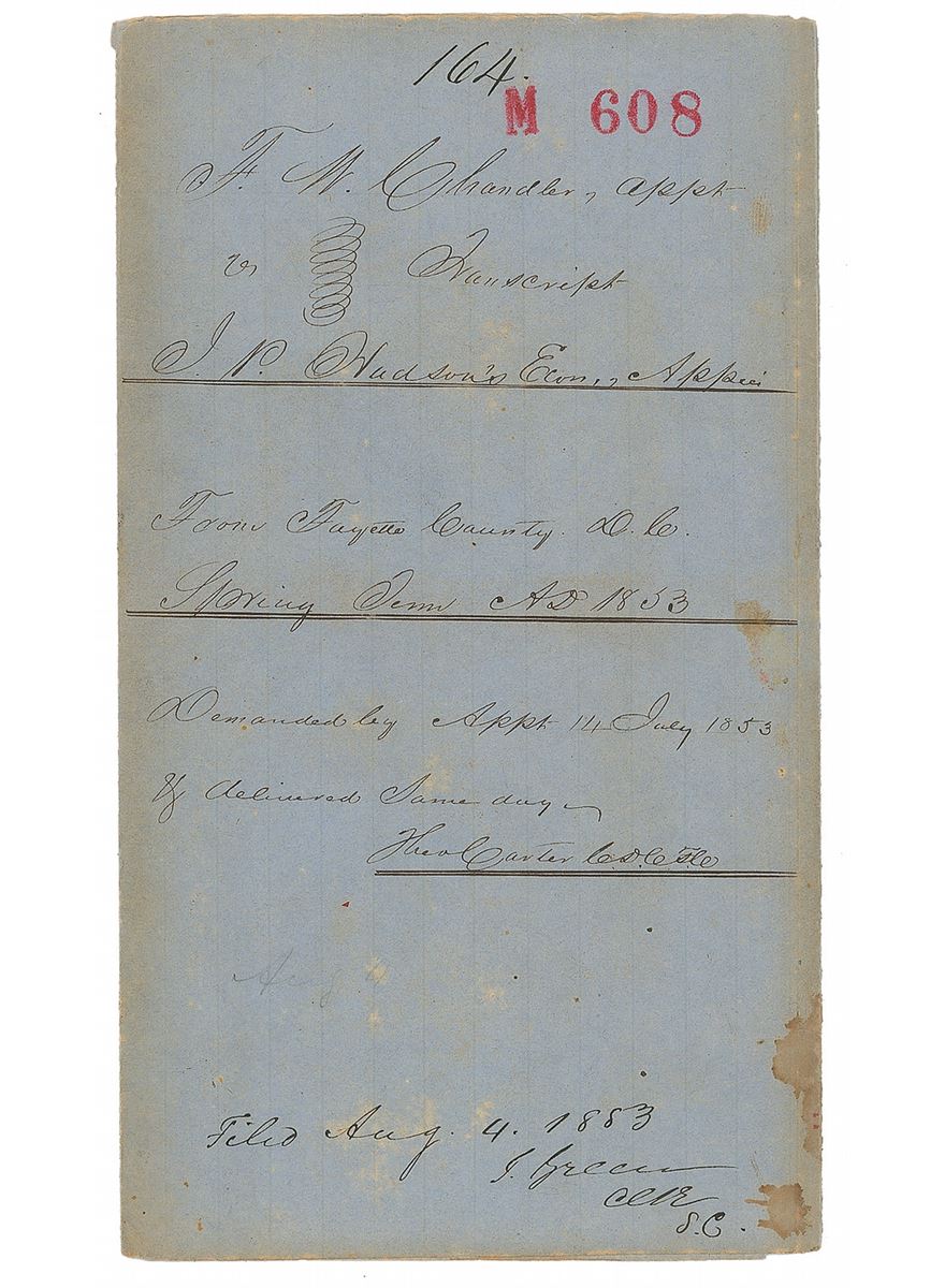 Confederate general (1814–1864) who served in the Texas Cavalry and was mortally wounded in battle. Autograph endorsement, “Filed Aug. 4, 1853, T. Green, Clerk, S. C.,” at the bottom of the docketing panel of the cover sheet for a Texas Supreme Court transcript, one page, folded to 4.75 x 8.25, July 14, 1853. In very good condition, with expected document wear, scattered toning and some staining to edges.