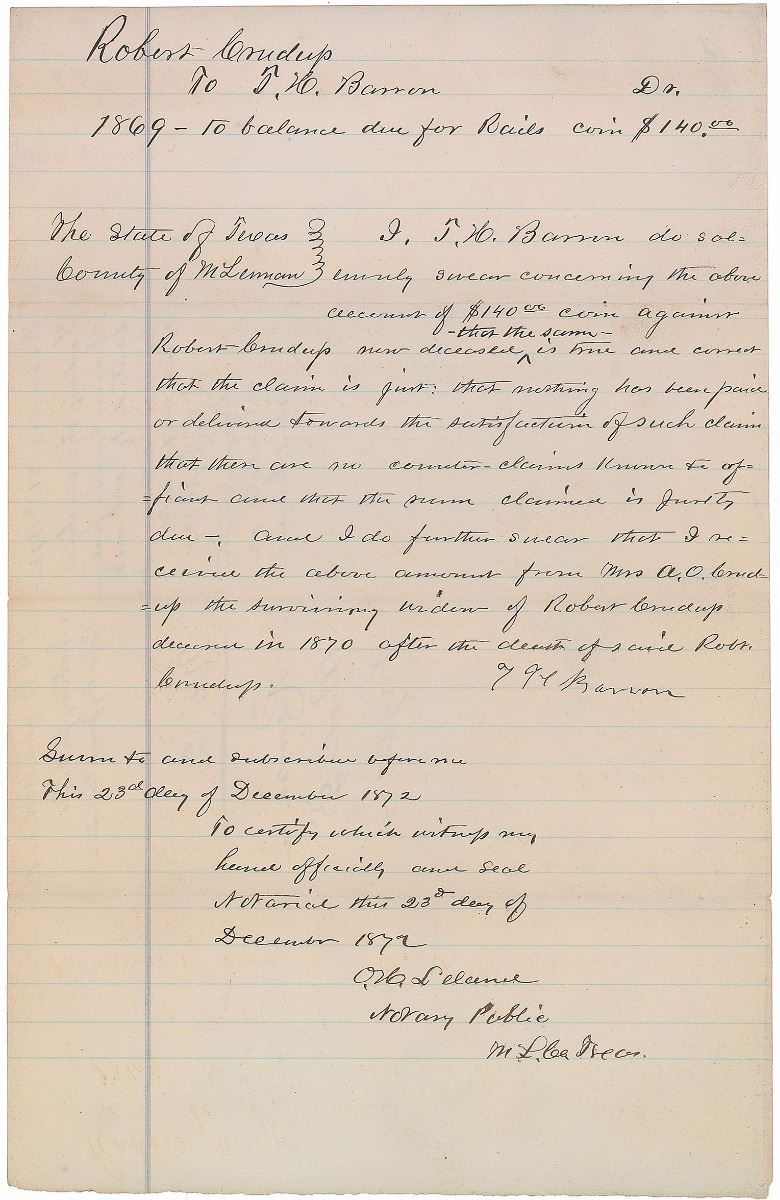 Early settler and notable Texas Ranger (1796–1874). Manuscript DS, signed “T. H. Barron,” one page, 8 x 12.5, December 23, 1872. Legal document concerning a posthumous rail payment, in part: “I, T. H. Barron do solemnly swear concerning the above amount of $140.00 coin against Robert Crudup new deceased that the sum is true and correct that the claim is just...and I do further swear that I received the above amount from Mrs. A. O. Crudup the surviving widow.” In fine condition, with expected document wear. Provenance: The Robert Davis Collection.