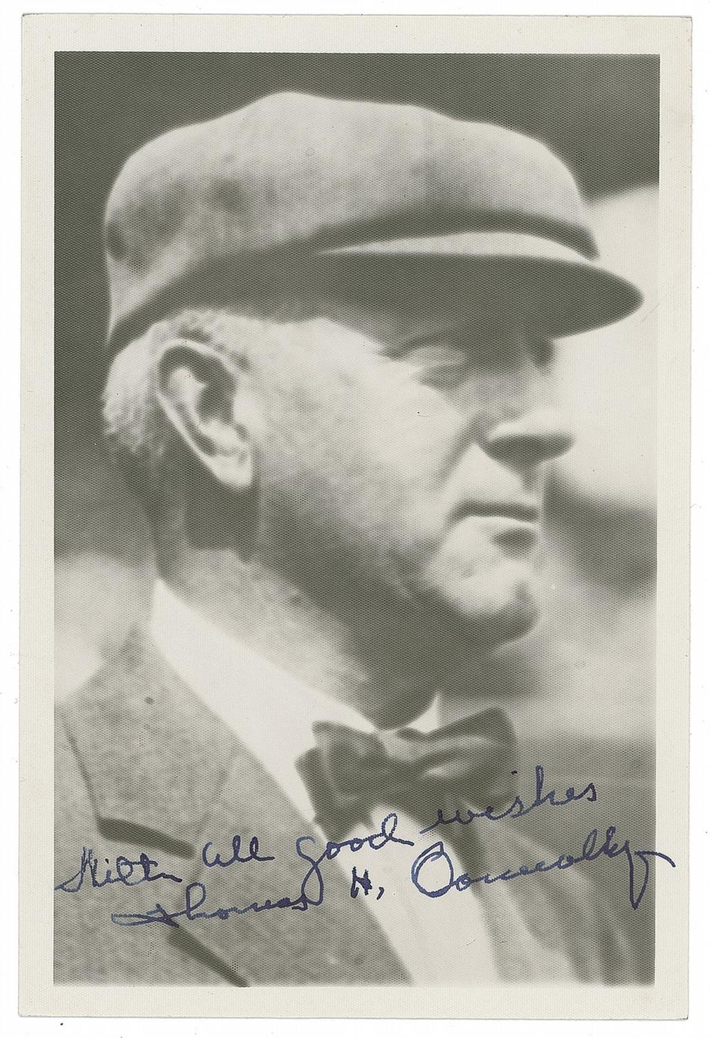 Baseball Hall of Fame umpire (1870-1961). He umpired the first American League game in 1901. Vintage matte-finish 4 x 6 head-and-shoulders photo of Connolly in his hat and bow tie, signed in blue ink, “With all good wishes, Thomas H. Connolly.” Reverse is stamped “Repr. By Geo. Brace Photo.” In fine condition.