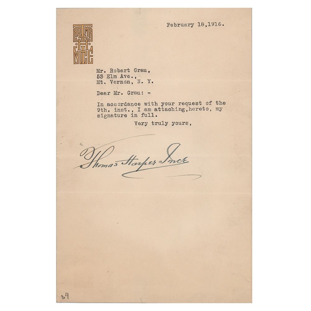 Silent film star, director, producer, and screenwriter (1882–1924). World War I-dated TLS, signed "Thomas Harper Ince," one page, 5.75 x 8.75, personal letterhead, February 18, 1916. Letter to Robert Grau, in full: "In accordance with your request of the 9th. inst., I am attaching, hereto, my signature in full." In fine condition.