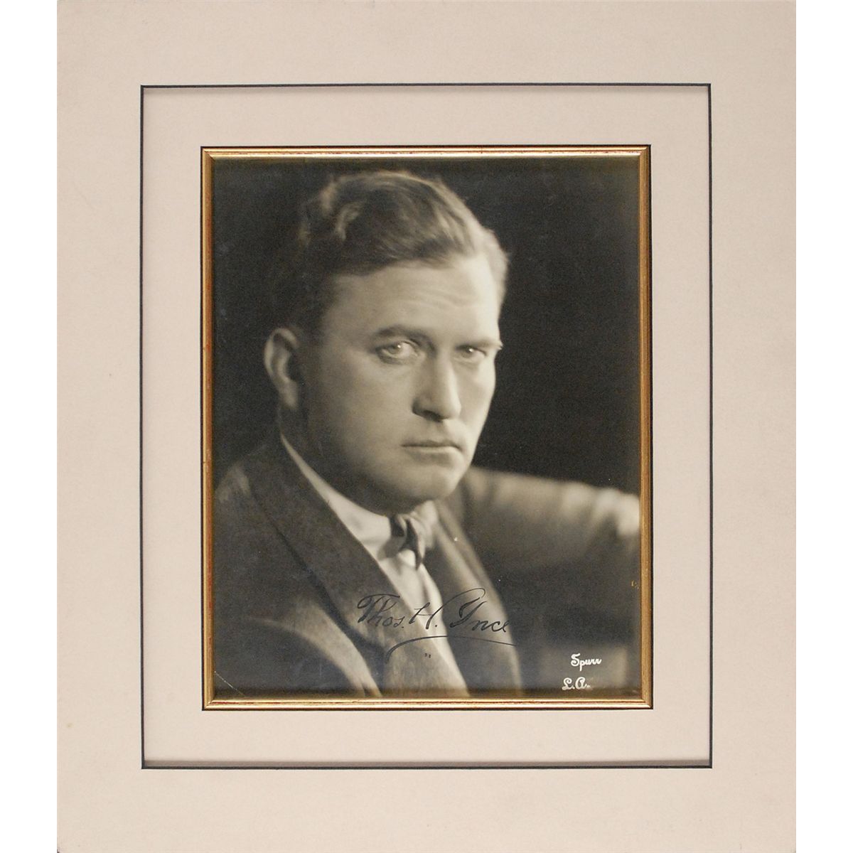 Silent film star, director, producer, and screenwriter (1882–1924). Vintage pearl-finish 7.25 x 9.25 portrait of Ince by Melbourne Spurr, signed in fountain pen, “Thos. H. Ince.” Double-matted to an overall size of 12.5 x 14.5. In very good to fine condition, with scattered creases and surface marks. Though his death was announced to be of natural causes, rumors of foul play were widely circulated, with many claiming that William Randolph Hearst accidentally shot and killed Ince during a party on board his yacht. Given Ince’s importance in Hollywood history and unusual early death, his autographic material is both very collectible and extremely rare.