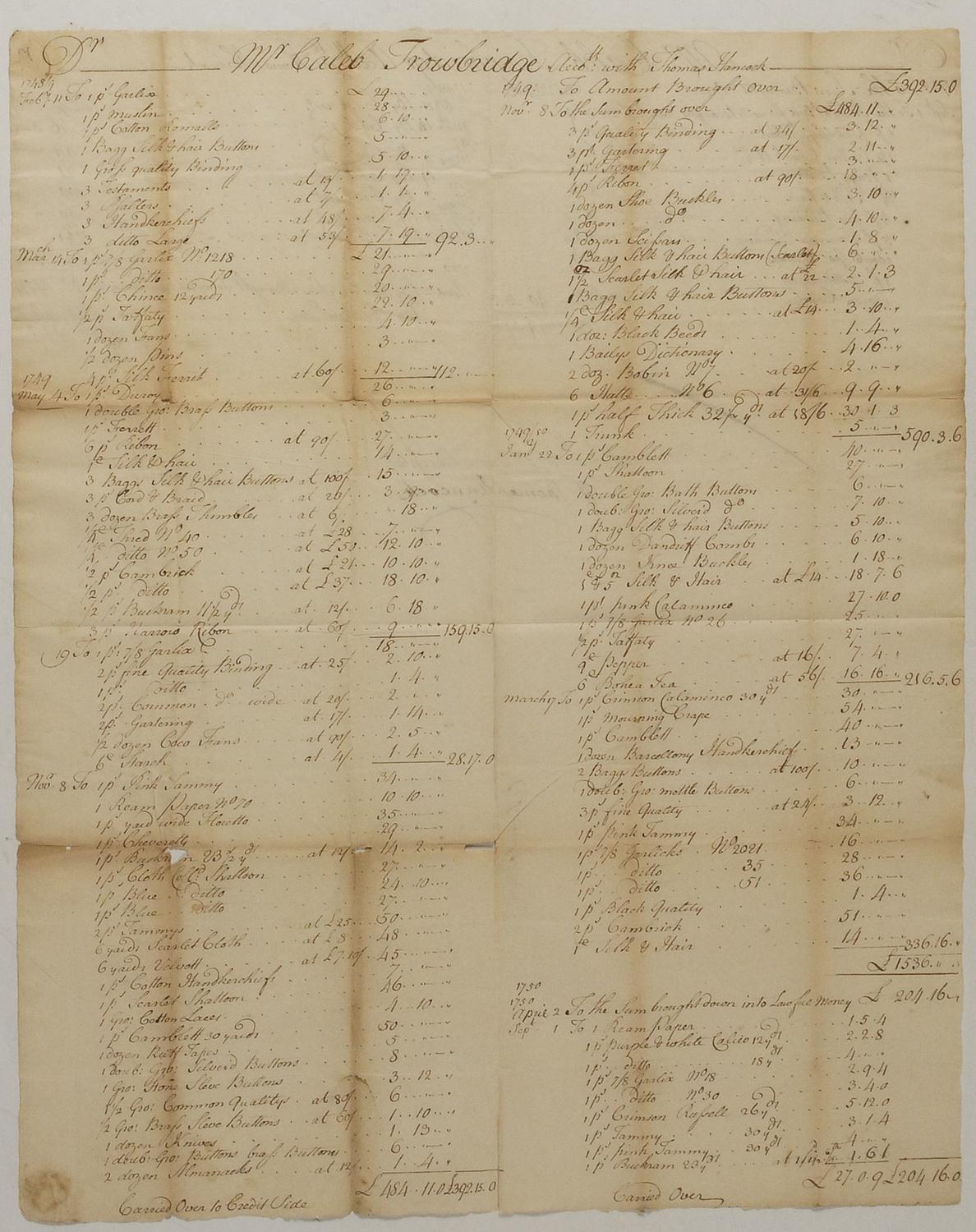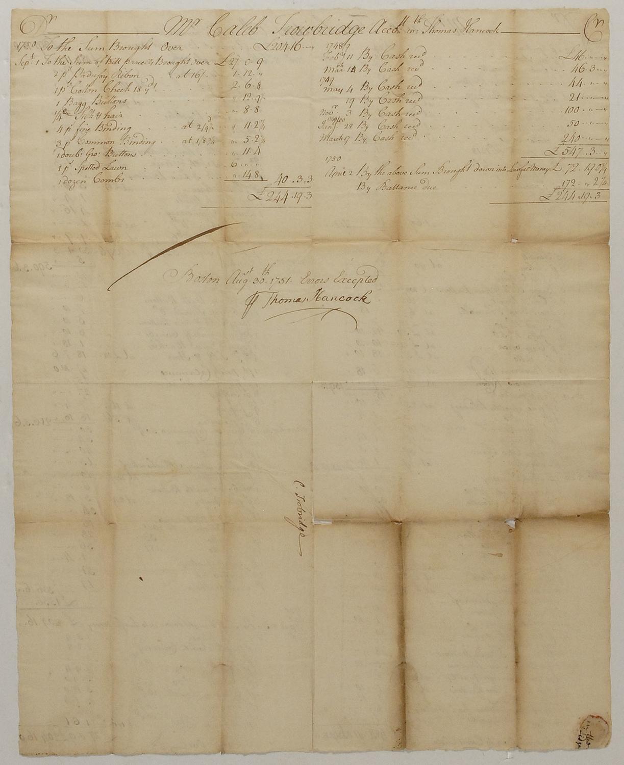 One of the wealthiest and most successful Boston merchants (1703-1764) and the uncle of John Hancock. Manuscript DS, one page both sides, 15 x 18.5, August 30, 1751. A very detailed account between Caleb Trowbridge and Hancock between 1748–1750 for a large amount of dry goods, including fabrics (silk, muslin, cotton, and lace), paper, books, shoe buckles, ribbon, knives, Bohea tea, and mourning crepe. Signed on the reverse by Hancock. In very good condition, with intersecting folds, one through a single letter of signature, a few small areas of paper loss along folds, and scattered toning, heavier along folds.