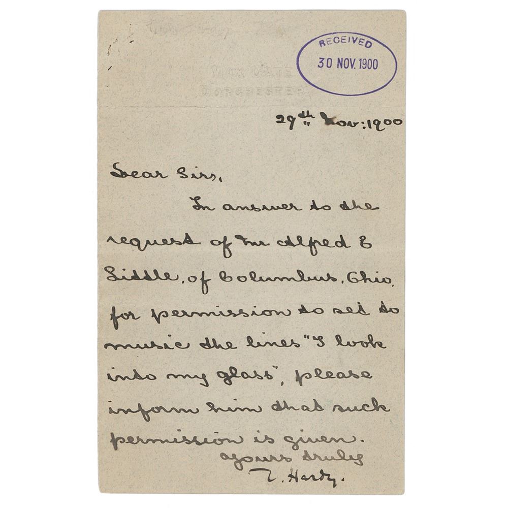 LS signed “T. Hardy,” one page, 4.5 x 7, Max Gate, Dorchester letterhead, November 29, 1900. The letter reads, in full: "In answer to the request of Mr. Alfred E. Liddle of Columbus, Ohio, for permission to set to music the lines 'I look into my glass,' please inform him that such permission is given." In fine condition, with small splits to the ends of the mailing folds.