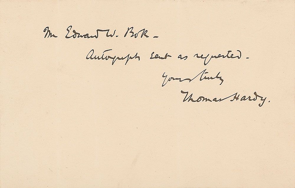 Author (1840–1928) of such classic novels as Far from the Madding Crowd and Tess of the d’Urbervilles who takes a place among the towering figures of British literature. ANS, one page, 6 x 4, no date. Letter to author and editor Edward Bok. In full: “Autograph sent as you requested.” In fine condition, with three vertical folds.