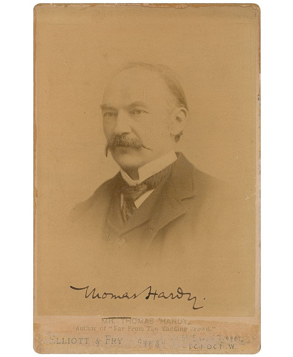 Author (1840–1928) who takes a place among the towering figures of British literature with classic novels such as Far from the Madding Crowd and Tess of the d’Urbervilles. Original 4.25 x 6.5 cabinet photo of Hardy, signed at the bottom of the image in black ink, “Thomas Hardy.” Published by Elliott & Fry of London and captioned in the lower border, “Mr. Thomas Hardy, Author of ‘Far From The Madding Crowd.’” Adhesive remnants and some light surface loss to edges of the mount, otherwise fine condition. Just the second Hardy signed photo we have ever offered, featuring a sharp image and bold signature.