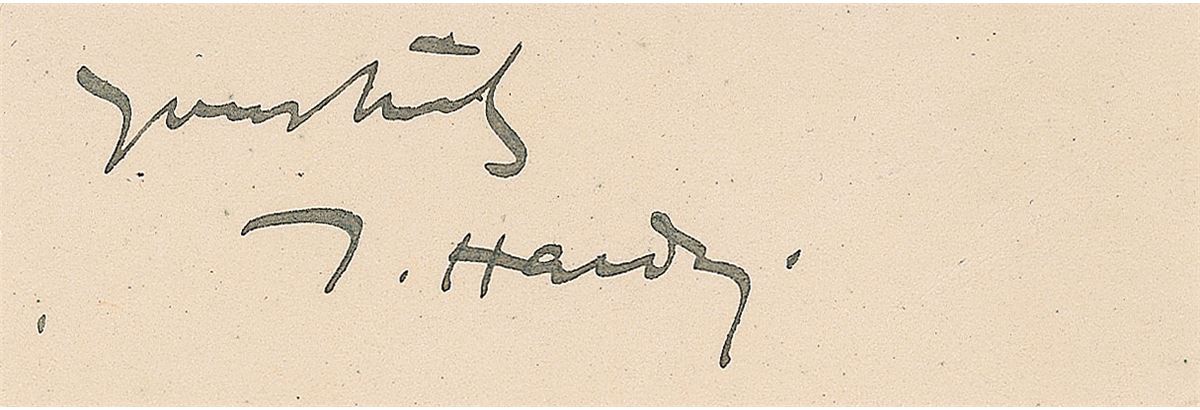 Fountain pen signature, “Yours truly, T. Hardy,” on an off-white 3 x 1 clipped card. In fine condition.