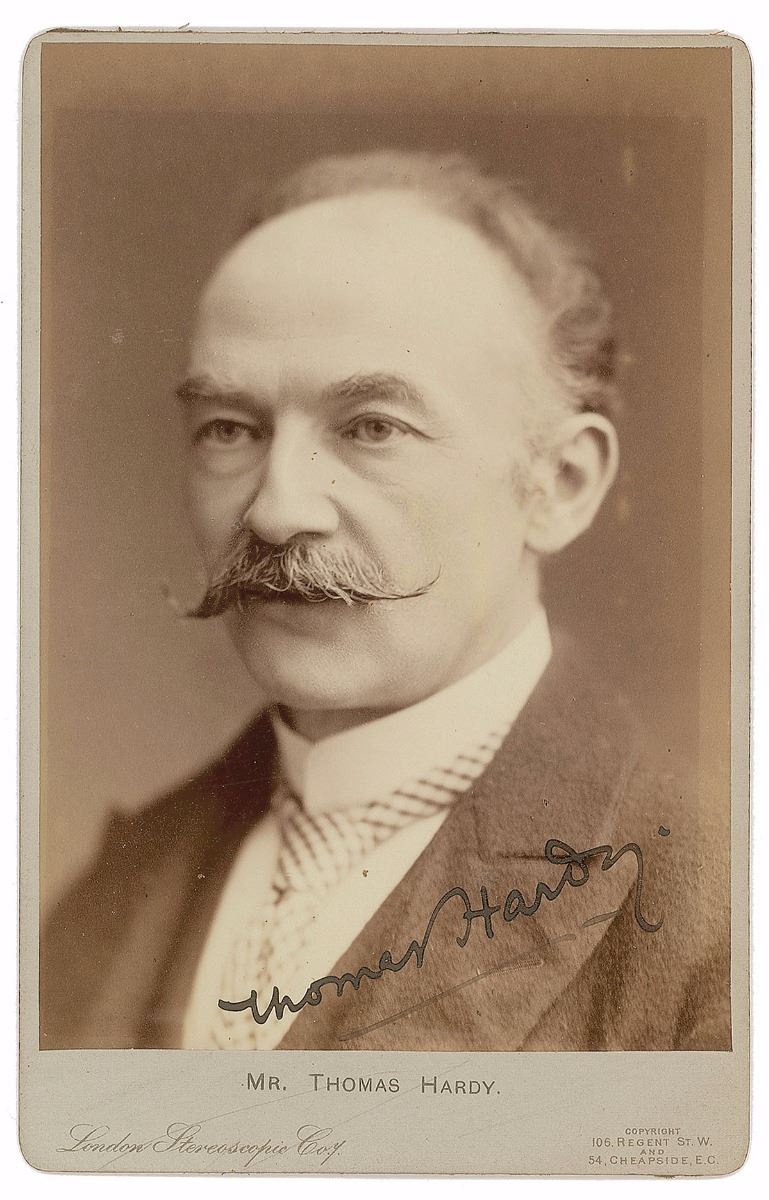 Esteemed author (1840–1928) who takes a place among the towering figures of British literature with classic novels such as Far from the Madding Crowd and Tess of the d’Urbervilles. Rare 4.25 x 6.5 cabinet portrait of Hardy, signed in black ink. Published by The London Stereoscopic Company. In fine condition, with a uniform block of toning from previous display and mounting remnants to reverse. Accompanied by the original transmittal envelope from New York’s Swann Galleries. An exceptionally clear, boldly signed image of the sought-after English novelist.