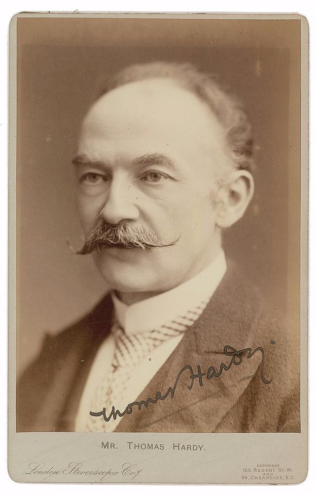 Esteemed author (1840–1928) who takes a place among the towering figures of British literature with classic novels such as Far from the Madding Crowd and Tess of the d'Urbervilles. Rare 4.25 x 6.5 cabinet portrait of Hardy, signed in black ink. Published by The London Stereoscopic Company. In fine condition, with a uniform block of toning from previous display and mounting remnants to reverse. Accompanied by an envelope from Swann Galleries, where it was previously sold. An exceptionally clear, boldly signed image of the sought-after English novelist.