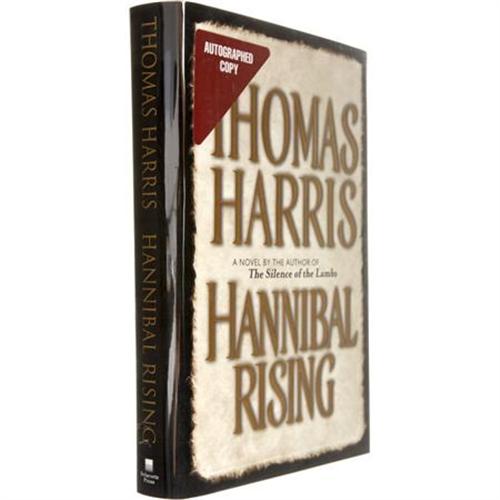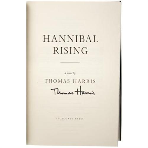 <B>Thomas Harris: Signed </B></I><B><I>Hannibal Rising</B></I></B></I> (New York: Delacorte Press, 2006), first edition, 323 pages, untrimmed edges, orange binding with black-cloth spine and gold lettering and Harris facsimile signature, 8vo (9.5” x 6.5”), dust jacket (in protective cover). Thomas Harris (b. 1940) was a crime reporter for the Associated Press before he wrote the hugely successful Hannibal Lechter novels <I>Red Dragon</B></I> (1981) and <I>Silence of the Lambs</B></I> (1988). This copy of <I>Hannibal Rising</B></I>, the third novel in the series, is boldly signed by the author on the title page. The book is in very fine condition; the dust jacket is fine with an “autographed copy” sticker attached to the front cover.<BR><BR><b>Shipping:</b> Books & Catalogs (<a target="_blank" href="http://www.heritageauctions.com/common/shipping.php">view shipping information</a>)