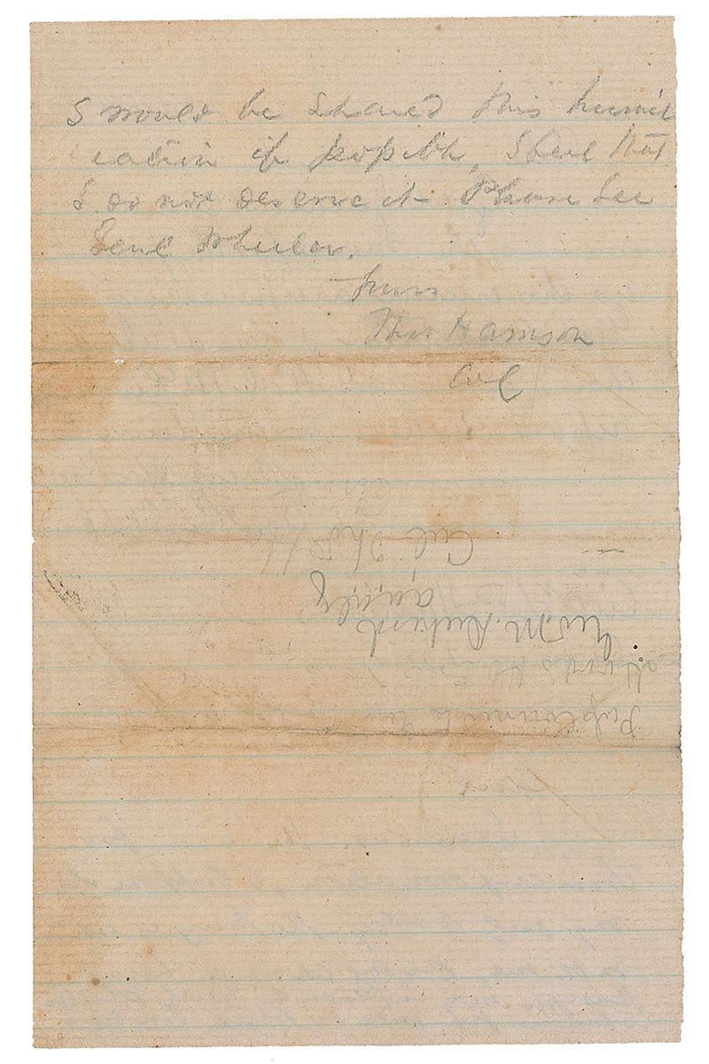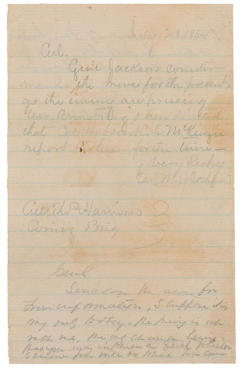 Confederate brigadier general (1823–1891). War-dated ALS signed “Thos. Harrison, Col,” one page, lightly-lined both sides, 4.75 x 7.5, July 28, 1864. Letter written below a request from George Deerhard which reads, “Genl. [William Hicks] Jackson countermands the move for the present as the enemy are pressing Gen. [Frank] Armstrong & has directed that Col. Hobson & Col. McKenzie report to him for the time.” Underneath, Harrison writes: “I enclose the above for your information. I suppose it is my duty to obey. The Brig. is up with me, the only chance being that you may influence Genl. [Joseph] Wheeler. I know you will do what you can. I would be spared this humiliation if possible. I feel that I do not deserve it.” A docketing notation is on the reverse in Deerhard’s hand allowing a courier to pass to headquarters. In very good condition, with scattered toning and creasing, and all text fairly light, but still legible.