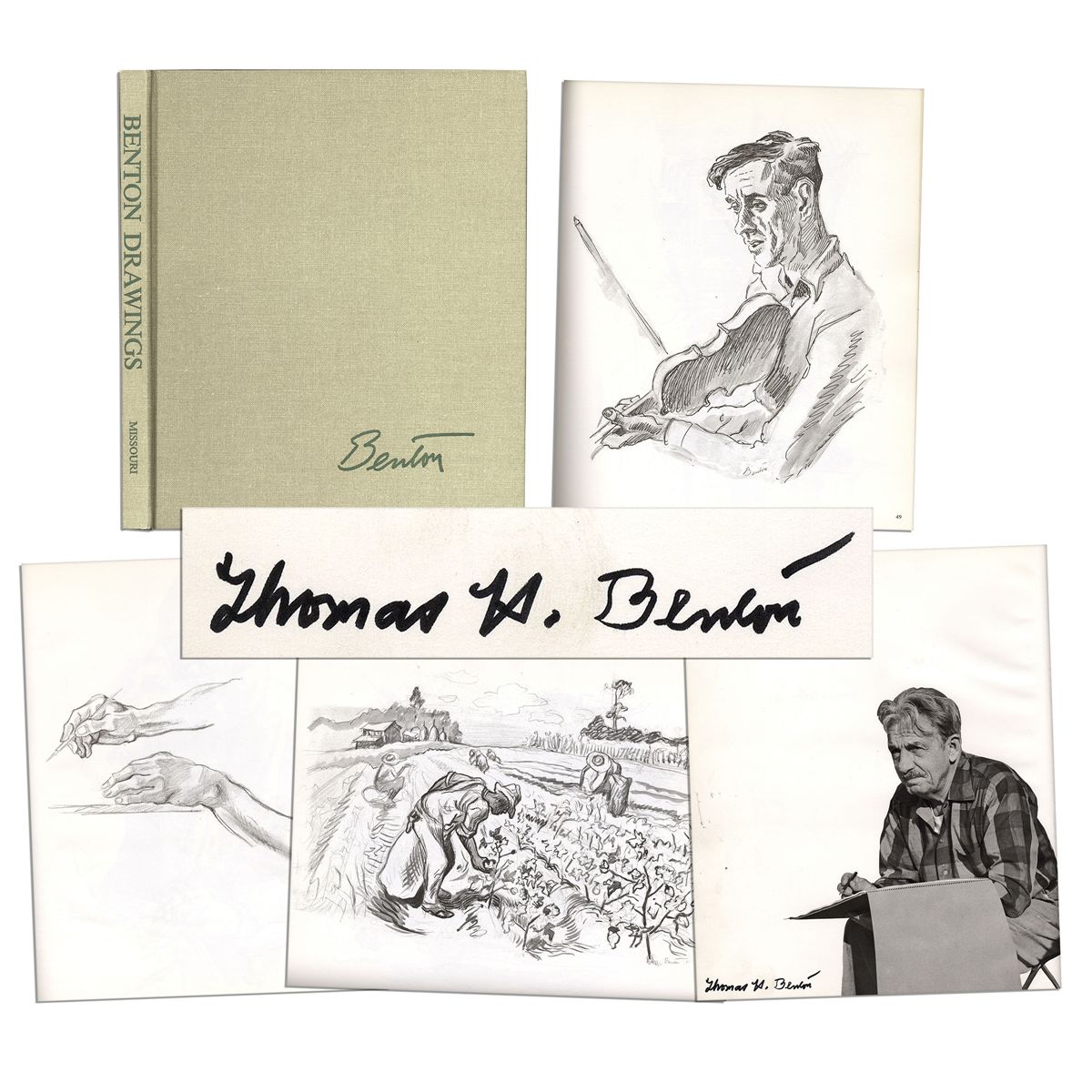 ''Benton Drawings: A Collection of Drawings by Thomas Hart Benton'' University of Missouri Press: Columbia: 1968. The catalog is signed on the frontispiece in black ink ''Thomas H. Benton.'' Benton, an esteemed American painter was known for his regional paintings portraying life throughout the country. 135pp. catalog contains 135 of Benton's sketches that were featured in a exhibition at the University of Missouri. The catalog measures 10.25'' x 11.75'' and has light chipping at its corners, otherwise in near fine condition.