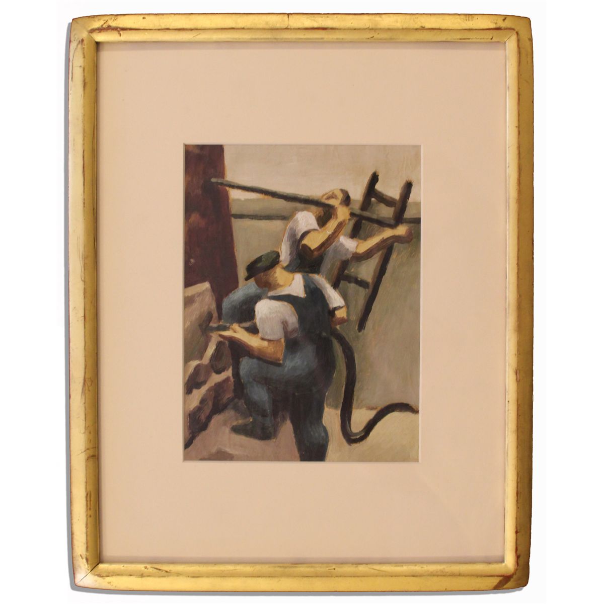 Thomas Hart Benton painting entitled ''Construction Workers''. 9'' x 6.75'' oil on paper is circa 1923. Benton, a leader of the regionalist movement, was a muralist, social critic and teacher of other important artists, including Jackson Pollock. His subject matter honored everyday American life, often ordinary people, such as these workers, in the throes of hard work. Provenance: William Neuse, New York (acquired directly from the artist); Sotheby's.