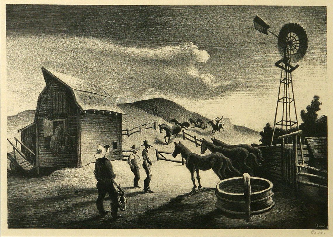 Thomas Hart Benton (1889-1975). The Corral. 9 ¾" x 13 ?" lithograph. Pencil signed lower right margin: Benton. Associated American Artists label affixed verso. (est. $3,000-4,000). CONDITION REPORTS: www.auctioninsantafe.com/docs/cr2012.pdf