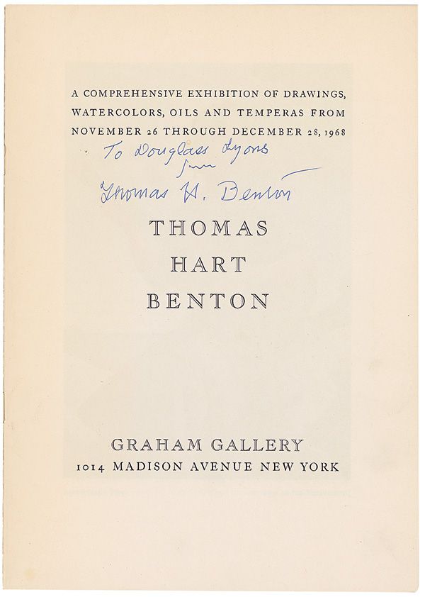 Renowned American artist (1889–1975) whose distinctive ‘regionalist’ style made him one of the most influential figures in American art during the 1930s and 1940s. Exhibition catalog, 7.25 x 10.25, for a showing of Benton’s work at the Graham Gallery in New York, held from November 26 to December 28, 1968, signed and inscribed on the title page in blue ballpoint “To Douglas Lyons, from Thomas H. Benton.” A light vertical crease, and some light toning and soiling to the cover, otherwise fine condition.