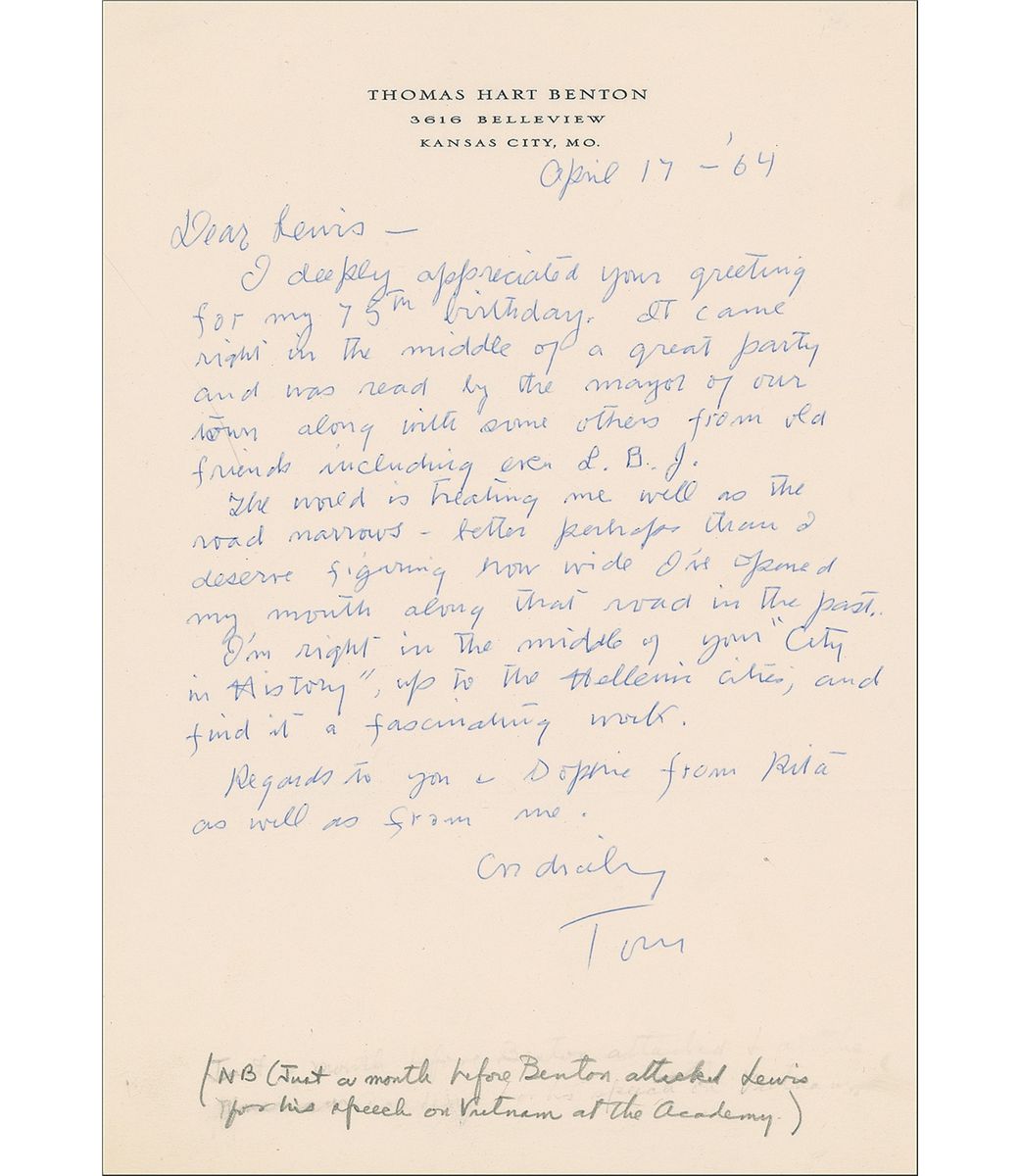 Renowned American artist (1889–1975) whose distinctive ‘regionalist’ style made him one of the most influential figures in American art during the 1930s and 1940s. ALS signed “Tom,” one page, 7.25 x 10.5, personal letterhead, April 17, 1964. Letter to critic Lewis Mumford. In part: “I deeply appreciated your greeting for my 75th birthday. It came right in the middle of a great party and was read…along with some others from old friends including even L. B. J. The world is treating me well as the road narrows—better perhaps than I deserve figuring how wide I’ve opened my mouth along that road in the past.” At the bottom, Mumford’s wife added a note that the letter was just a month before Benton attacked Mumford for his speech on Vietnam, which would cause serious strain in their relationship. In fine condition. Accompanied by an unsigned postcard photo of Benton.