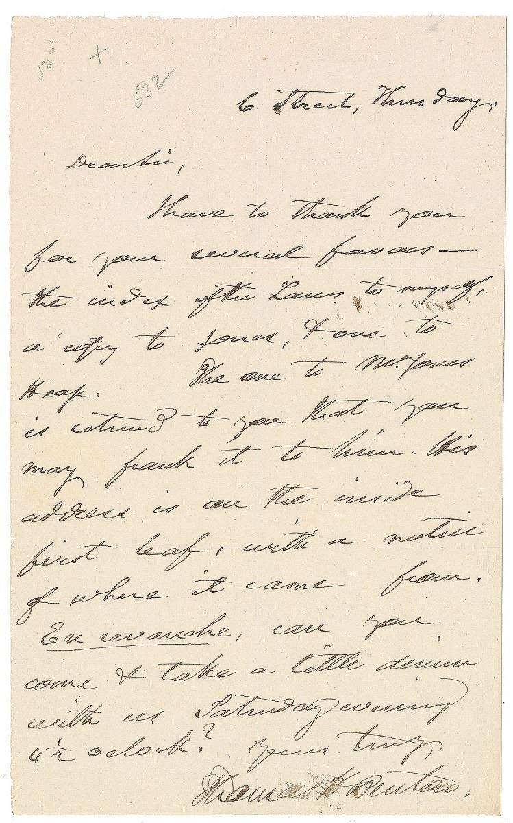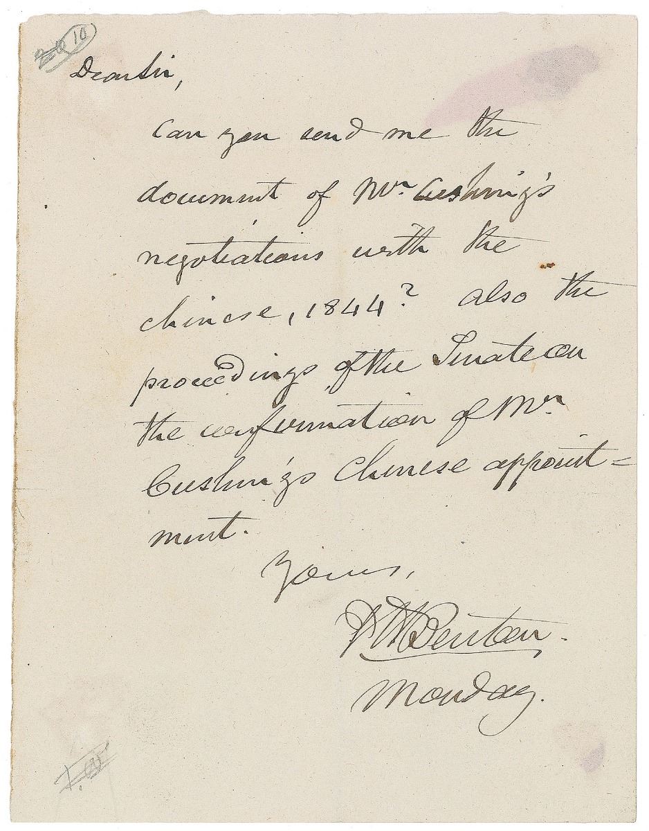 Longtime senator of Missouri (1782—1858) who was a strong advocate of westward expansion of the United States. Two ALSs signed “T. H. Benton” and “Thomas H. Benton,” both one page, 4.5 x 5.75 and 4.75 x 7.75, no dates. The first, in full: “Can you send me the document of Mr. Cushing’s negotiations with the Chinese, 1844? Also the proceedings of the Senate on the confirmation of Mr. Cushing’s Chinese appointment”; the second, in part: “I have to thank you for your several favors—the index of the Laws to myself, a copy to Jones, & one to Heap. The one to Mr. Jones is returned to you that you may frank it to him.” In overall fine condition, with old mounting remnants showing through from the reverse of the smaller letter.