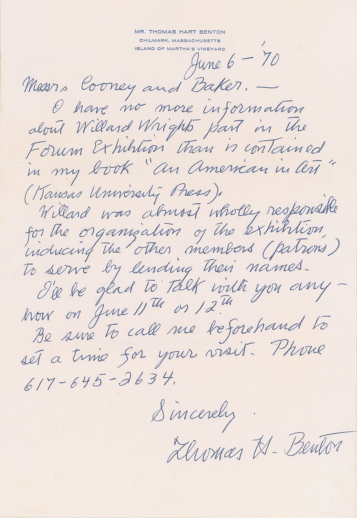 Renowned American artist (1889–1975) whose distinctive 'regionalist' style made him one of the most influential figures in American art during the 1930s and 1940s. ALS signed “Thomas H. Benton,” one page, 7.25 x 10.5, personal letterhead, June 6, 1970. Letter to "Messrs Cooney and Baker," in part:"I have no more information about Willard Wright's part in the Forum Exhibition than is contained in my book 'An American in Art' (Kansas University Press). Willard was almost solely responsible for the organization of the exhibition inducing other members (patrons) to serve by lending their names. I'll be glad to talk with you anyhow on June 11th or 12th." In fine condition. Accompanied by the original mailing envelope addressed in Benton's hand. A noted art critic, Wright organized the pioneering 'Forum Exhibition of Modern American Painters' in 1916, which brought the works of sixteen American Modernists—including Benton—to the public's attention.