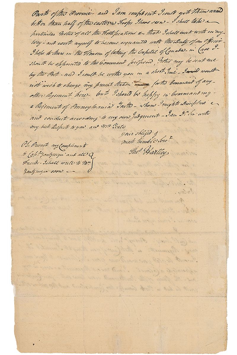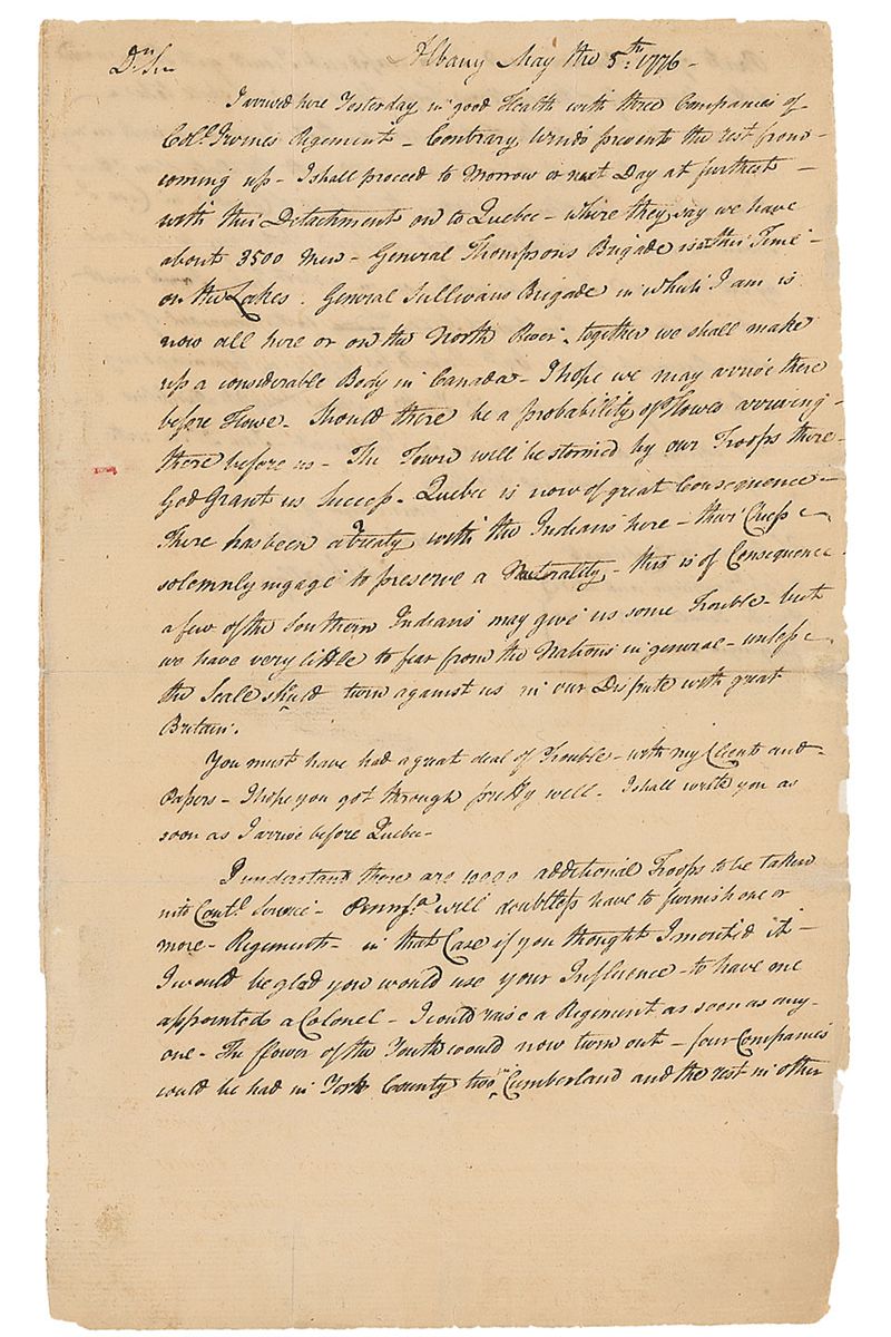 Pennsylvania lawyer, soldier, and politician (1748–1800) who commanded the 6th Pennsylvania in the Continental Army and led a 1778 expedition against the Iroquois to avenge the Wyoming Massacre. Revolutionary War–dated ALS signed “Thos. Hartley,” one page both sides, 8 x 13, May 5, 1776. Letter to Pennsylvania jurist Jasper Yeates. In part: “I arrived here yesterday in good health with three companies of Col. Irvines Regiment. Contrary winds prevent the rest from coming up. I shall proceed to Morrow or next Day at furthest with this detachment on the Quebec—where they say we have about 3500 men—General [William] Thompsons Brigade is at this time on the Lakes. General Sullivans Brigade in which I am is now all here or on the North River; together we shall make up a considerable Body in Canada. I hope we may arrive there before Howe. Should there be a probability of Howes arriving there before us—the Town will be stormed by our Troops there. God grant us success. Quebec is now of great consequence—there has been a treaty with the Indians here—their Chiefs solemnly engage to preserve a Neutrality—this is of consequence—a few Southern Indians may give us some trouble—but we have very little to fear from the Nations in general—unless the scale should turn against us in our dispute with Great Britain…I understand there are 10,000 additional troops to be taken into Cont. Service Penna will doubtless have to furnish one or more Regiments—in that case if you thought I merited it—I would be glad you would use your influence to have me appointed a Colonel. I could raise a Regiment as soon as anyone. The flower of the South would now turn out—four companies could be had in York County two in Cumberland and the rest in other parts of the province—and I am confident I could get them armed better than half of the eastern troops I have seen. I shall take particular notice of all the fortifications that I shall meet on my way—and exert myself to become acquainted with the Duty of an Officer. I hope to share in the honour of taking the Capital of Canada—in case I should be appointed to the Command proposed. Notice may be sent me by Post—and I could be with you in a short time. I would not wish to change my present station for the command of any other regiment here—but I should be happy in commanding a Regiment of Pennsylvanians South—whom I might discipline and conduct according to my own judgement.” In very good condition, with unobtrusively repaired partial separations to horizontal folds. The following month, the Continental Army, under command of those mentioned in this letter, drastically underestimated British troop strength and attacked them at Trois Rivieres. After being easily defeated, the American troops retreated, marking the last major battle in the US invasion of Quebec.