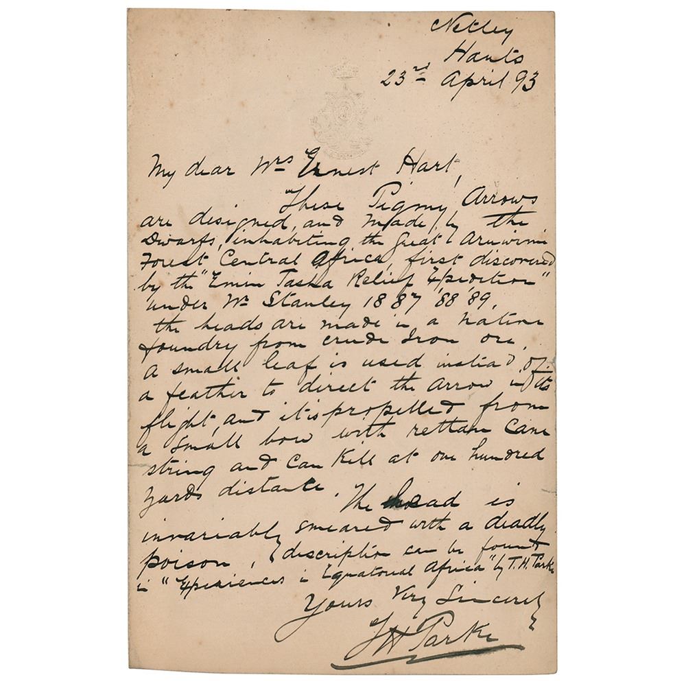 Irish physician, British Army officer, and author (1857–1893) who was known for his work as a doctor on Henry Morton Stanley's 'Emin Pasha Relief Expedition.' ALS signed “T. H. Parke,†one page, 4.5 x 7, embossed Army Medical Staff letterhead, April 23, 1893. Handwritten letter to English medical journalist Ernest Hart, in full: "These Pygmy Arrows are designed and made, by the Dwarfs, inhabiting the Great Aruwimi Forest Central Africa, first discovered by the 'Emin Pasha Relief Expedition' under Mr. Stanley 1887 '88 '89. The heads are made in a native foundry from crude iron ore. A small leaf is used instead of a feather to direct the arrow in its flight, and it is propelled from a small bow with rattan cane string and can kill at one hundred yards distance. The head is invariably smeared with a deadly poison, description can be found in 'Experiences in Equatorial Africa' by T. H. Parke." In fine condition.