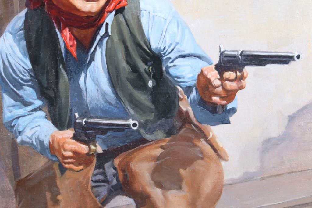 Featured in this lot is a Thomas Helprin, Gunfight, original oil painting and study. Thomas Helprin was an American artist known for his depictions of cowboys. The painting displays a gunman with two revolvers, standing over a dead man. The gunman is shown in a blue shirt, green vest, and leather chaps. The figures are standing at the front of a door of a clay formed house. The back of the piece shows the original pencil study, showing a rough design. The piece is set into a custom wooden frame. Provenance: The piece was listed as being an original Thomas Helprin, Gunfight Illustration from Pulp Magazine Cover and was valued at $3,000 in Best of the West Manitou Gallery 2004 sale. The piece shows good condition overall, with some light wear across the frame. The frame measures 26 1/4" wide by 37 3/4" tall with the art measuring 18" wide by 29 1/2" tall.