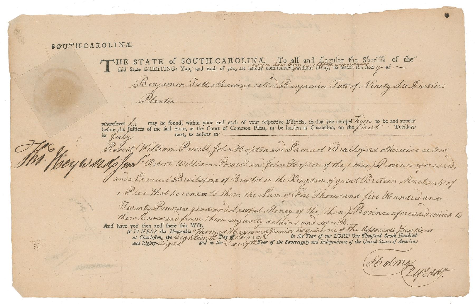Partly-printed DS, signed “Tho's Heyward Jun'r,” one page, 13 x 8, March 18, 1788. Order issued in South Carolina, ordering that planter Benjamin Tutt be compelled to "be and appear before the Justices of the said State, at the Court of Common Pleas…to answer to Robert William Powell, John Hopton and Samuel Brailsford…of a plea that he render to them the sum of Five Thousand five Hundred and Twenty Pounds." Boldly signed in the upper left by Heyward. The white paper seal affixed to the upper left remains intact. In fine condition.