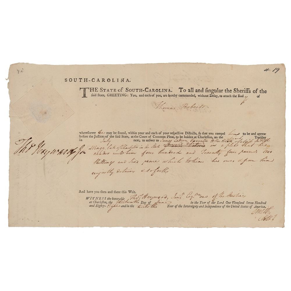 Partly-printed DS, signed “Tho. Heyward, Jnr.,†one page, 12.75 x 7.5, June 13, 1788. As the Circuit Judge of Charleston, South Carolina, Heyward directs the sheriffs of South Carolina to apprehend Thomas Roberts, a former Continental Army officer who fought at the Battle of Camden, and bring him to court to answer charges that he owed 242 pounds, two shillings, and six pence. Signed prominently by Heyward in the left margin, which also bears the original paper seal. In fine condition.
