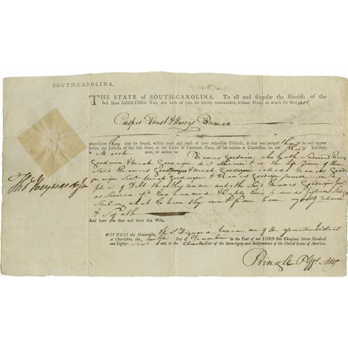 <B> Declaration of Independence Signer Thomas Heyward, Jr Signed Document</B></I> A 1756 arrest warrant, signed by Hewyard as a South Carolina judge. 12.5" x 7.75," Very fine condition, with large, bold black ink signature. An attractive display item for this Declaration Signer.