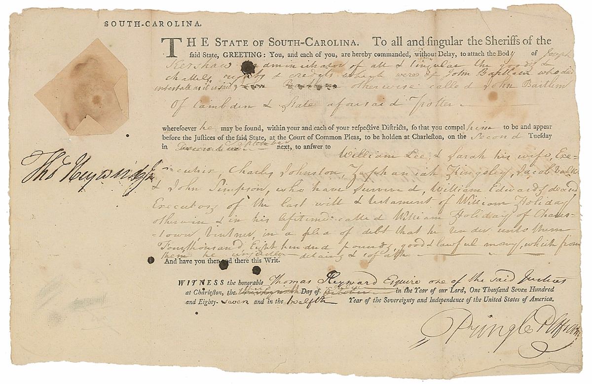 Partly-printed DS, signed “Thos. Heyward Junr.,” one page, 12.75 x 8.25, July 3, 1787. A summons issued to a sheriff, commanding him to “attach the Body of Joseph Kershaw…so that you compel him to be and appear before the Justices of the said State.” Signed on the left side below the affixed white paper seal. Expected document wear, scattered stray ink spots and small stains, and chipping to edges, otherwise fine condition.
