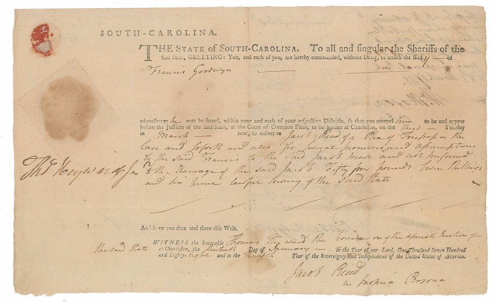 Signer of the Declaration of Independence from South Carolina (1746–1809) who was taken prisoner by the British during the siege of Charleston and held for about a year. Partly-printed DS, signed “Tho. Heyward Jnr.,” one page, 12.75 x 7.75, January 30, 1788. A summons issued to a sheriff, commanding him to “attach the Body of Francis Goodwyn, wheresoever he may be found…to be and appear before the Justices of the said State…to answer to Jacob Read of a plea of Trespass…and also for several promises and assumptions made by Francis to the said Jacob made and not performed to the damage of the said Jacob of Fifty four pounds Seven Shillings and Six Pence.” Boldly signed on the left side below the affixed white paper seal. In fine condition, with areas of light soiling.