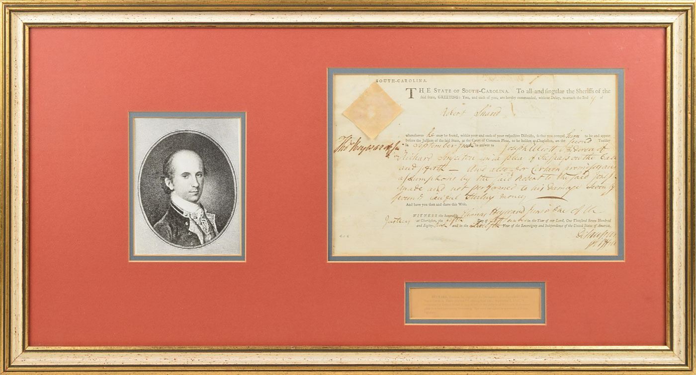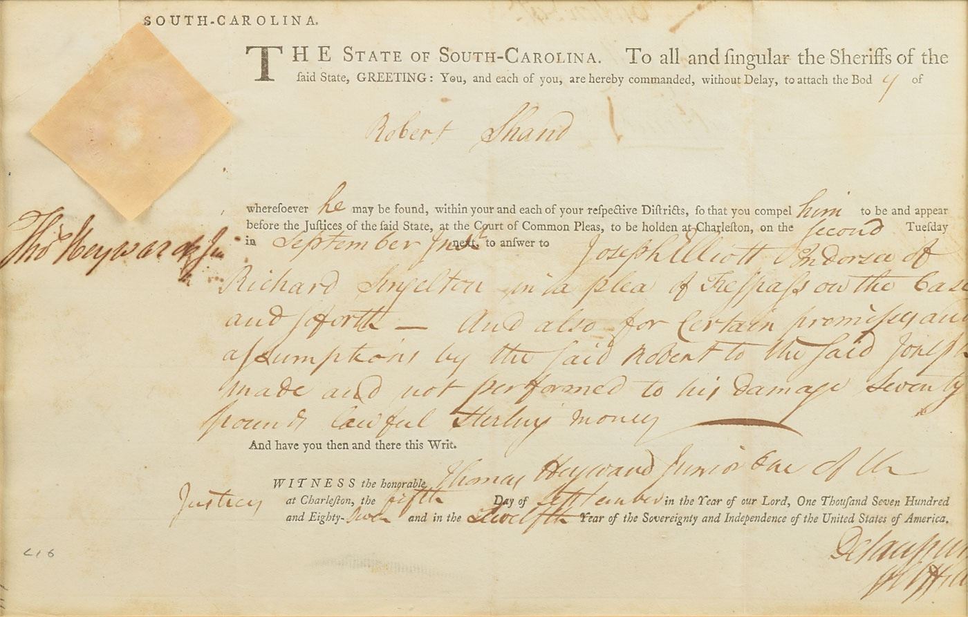 Signer of the Declaration of Independence from South Carolina (1746–1809) who was taken prisoner by the British during the siege of Charleston and held for about a year. Partly-printed DS, signed “Tho's Heyward, Jr.,” one page, 12 x 7.75, September 5, 1787. Summons issued to the sheriffs of South Carolina, ordering Robert Shand to be brought "before the Justices of the Said State, at the Court of Common Pleas, to be holden at Charleston…to answer to Joseph Elliott…in a plea of Trespass." Boldly signed in the upper right by Heyward. The white paper seal affixed to the upper left remains intact. Nicely double-matted and framed with a portrait to an overall size of 29 x 16. In fine condition.