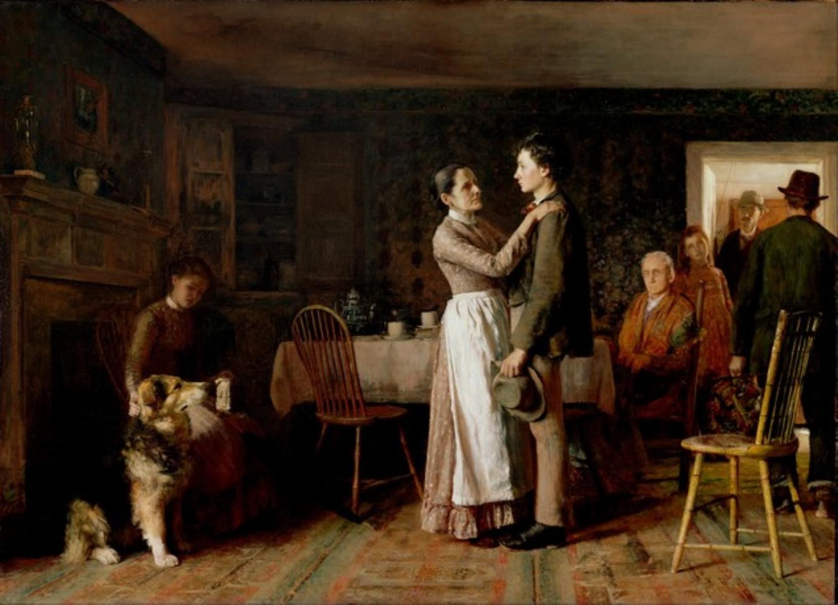 Artist: Thomas Hovenden - Title: Breaking Home Ties - Medium: Fine Art Giclee on Canvas - Image Size: Approximately 23 inches x 32 inches - Framed: Unframed on Unstretched Canvas - Biography: Thomas Hovenden (December 28, 1840 - August 14, 1895), was an Irish artist and teacher. He painted realistic quiet family scenes, narrative subjects and often depicted African Americans.