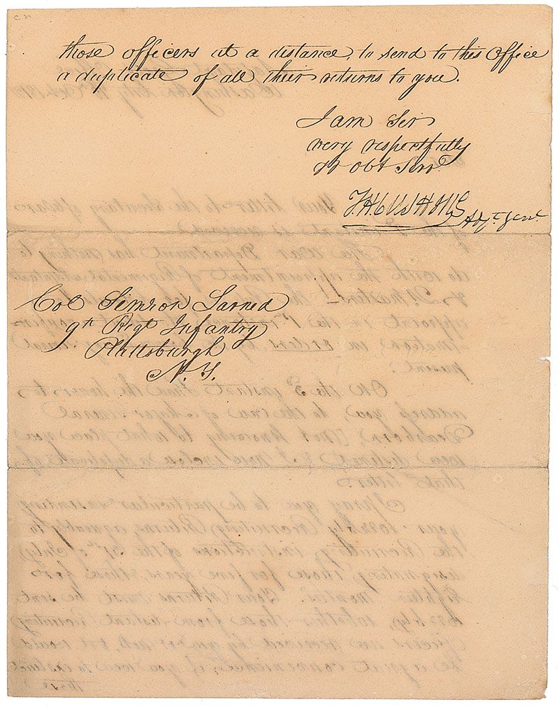Officer in the Continental Army who, in 1816, fought a duel with Virginia Congressman William J. Lewis and was saved when the bullet struck his watch (1755–1822). War-dated LS signed “T. H. Cushing, Adj’t Gen’l,” one page, 7.5 x 9.75, October 16, 1812. Letter to Colonel Simon Larned. In part: “The War Department has nothing to do with the appointment of Regimental Adjutants & Qt. Masters. The Rule is, for Colonels to appoint in the 1st instance & to solicit a confirmation in orders, by the Commanding General present.” In very good to fine condition, with scattered creases, light overall toning, a noticeable tear to the left border and a couple smaller edge tears, and show-through from writing to opposing sides.