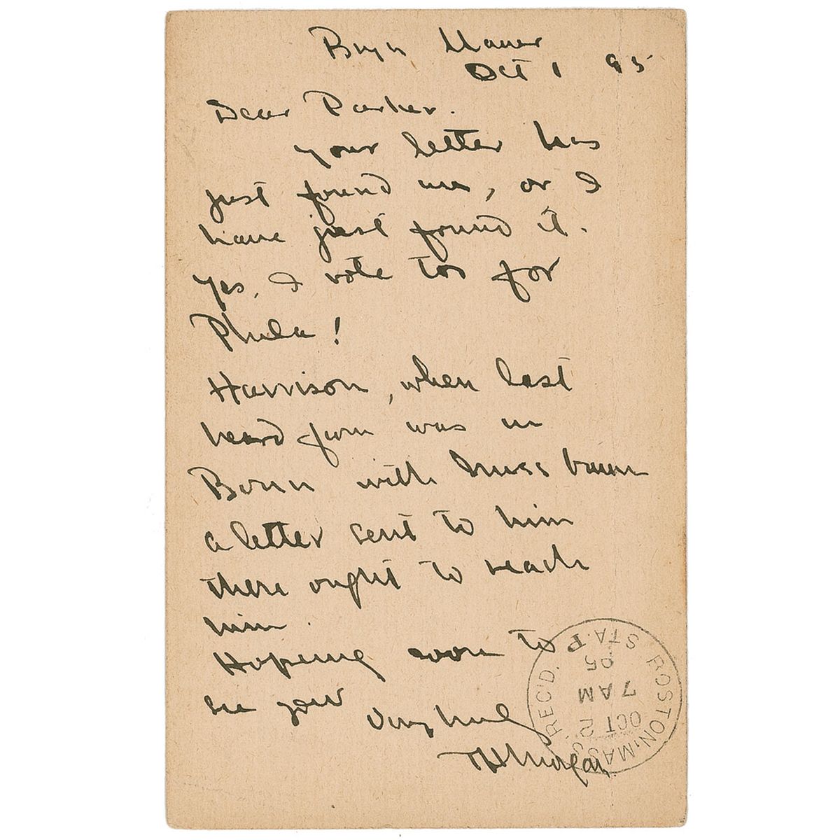 In 1933 he received the Nobel Prize in physiology for his studies of the role of chromosomes in heredity. ALS on the reverse of a one-cent postal card, 3.5 x 5.5, October 1, 1895. In a brief letter, Morgan writes, in part: “Your letter has just found me, or I have just found it. Yes, I vote too for Phila!” In very good condition, with a postmark affecting the end of the signature, a vertical crease running along the left edge, and a uniform shade of toning.