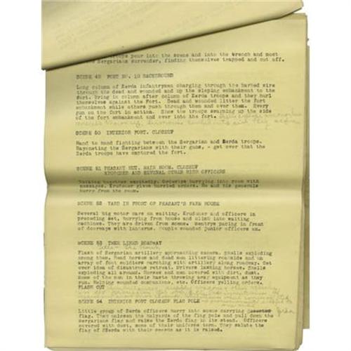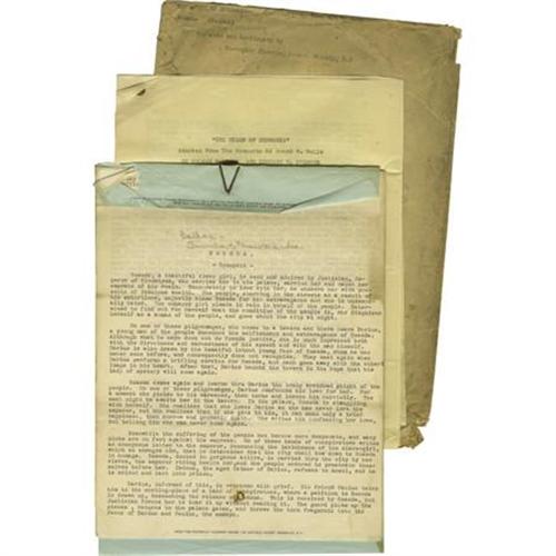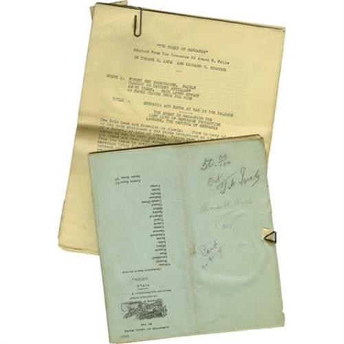 <B>Thomas H. Ince Signed Continuity Script and Original Ince Shooting Script.</B></I> In 1914, film pioneer Thomas Harper Ince paid $50 for a synopsis and continuity script for <I>Roseda,</B></I> signing on the cover "T H Ince" under the price and his handwritten "O.K." in pencil. The signature, a rare one indeed, maintains Ince's reputation as the very first truly prolific film producer/director. He snapped up this treatment, from writer Avard W. Wells, along with hundreds of others in a flurry to gather as many film ideas around him as possible, for Ince was shooting multiple features at the same time, delegating duties to directors, assistant directors, writers and editors. Also included in this lot is a shooting script written by Ince (with his credits on the cover page) with handwritten notations throughout its 58 pages, opening with Ince's instructions to use an iris lens and "dissolve in" slowly. The documents, some dated July 9, 1914, others undated, are in remarkably good condition considering their age and were brought to Heritage as part of a collection of documents from Triangle Motion Picture Company (Ince's production company formed with D.W. Griffith and Mack Sennett). In Very Good condition with age-toning and corner wear, minor nicks to borders and rusting from clips (none of which affect signature). Stored in their original filing envelope with Ince's credit listed at top. <I>From the Thomas H. Ince Archives.</B></I><BR><BR><b>Shipping:</b> Books & Catalogs (<a target="_blank" href="http://www.heritageauctions.com/common/shipping.php">view shipping information</a>)