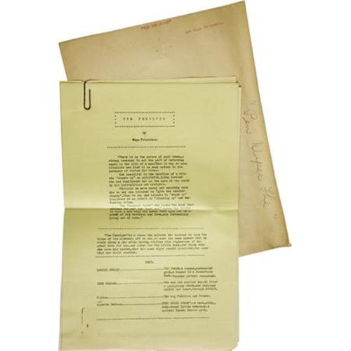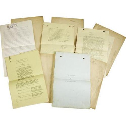 <B>Original Film Treatments and Shooting Scripts by Lambert Hillyer and Others from Triangle Motion Picture Company, 1915-18.</B></I> A total of 16 original story treatments and two shooting scripts from archives of Triangle Motion Picture Company (formed by Thomas H. Ince, D.W. Griffith, and Mack Sennett), including a film treatment by Lambert Hillyer (director of <I>The Invisible Ray,</B></I> 1936, and <I>Dracula's Daughter,</B></I> 1936). Also included is a story treatment by Olga Printzlau for the 1917 film <I>To Honor and Obey,</B></I> originally titled <I>The Pen Wiper</B></I> (starring Joseph Swickard and Jewel Carmen), as well as a film treatment by actor Percy Dempsey Tabler, star of <I>Son of Tarzan,</B></I> 1920. Lot also includes two shooting scripts by W.H. Clifford and additional film treatments by noted writers C. Gardner Sullivan, Robert Shirley, Jay Dwiggins, Henry C. Rowland, L.V. Jefferson, and actor Clyde Tracy (<I>Rumpelstiltskin,</B></I> 1915). In overall Very Good condition with center creasing, moderate age-toning, minor nicks to borders, and rusting from original clips. Each stored in original, labeled filing envelopes from Triangle archives. <I>From the Thomas H. Ince Archives.</B></I><BR><BR><b>Shipping:</b> Books & Catalogs (<a target="_blank" href="http://www.heritageauctions.com/common/shipping.php">view shipping information</a>)