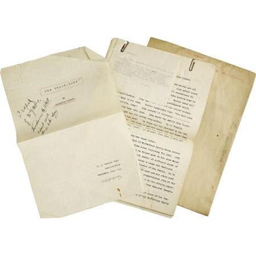 <B>Original Story Treatments and Shooting Scripts from Triangle Motion Picture Company, 1915-18.</B></I> A total of 16 original story treatments and two shooting scripts (unfilmed) from archives of Triangle Motion Picture Company (formed by Thomas H. Ince, D.W. Griffith, and Mack Sennett), including: <I>The Throwback</B></I> by Oscar-nominated writer Josephine Lovett, with notes on Ince's ownership (in an unknown hand) on cover: "Property of NYMPC. Purchased by T.H.I. (Thomas H. Ince) Finish will have to be changed." Ince directed films for New York Motion Picture Company (NYMPC) before partnering up with Griffith and Sennet in 1915, making this treatment a fairly early one from his Hollywood years, one that he took with him from NYMPC to Triangle. Other treatments include: <I>The Evil Intruder</B></I> by Monte Katterjohn, <I>God's Deal</B></I> by Julien Josephsen (with a note to hold for Ince written on cover), <I>The Eternal Fire</B></I> by Olga Printzlau, among others. Two "shooting scripts" are also included: <I>A Yankee Princess</B></I> by W.H. Clifford, and <I>Her Price</B></I> by Lanier Bartlett (with a handwritten note on the censors' editing of the "spicy" story). In overall Very Good condition with center creasing, moderate age-toning, minor nicks to borders, and very minor rusting from original clips. Each stored in original, labeled filing envelopes from Triangle archives. <I>From the Thomas H. Ince Archives.</B></I><BR><BR><b>Shipping:</b> Books & Catalogs (<a target="_blank" href="http://www.heritageauctions.com/common/shipping.php">view shipping information</a>)